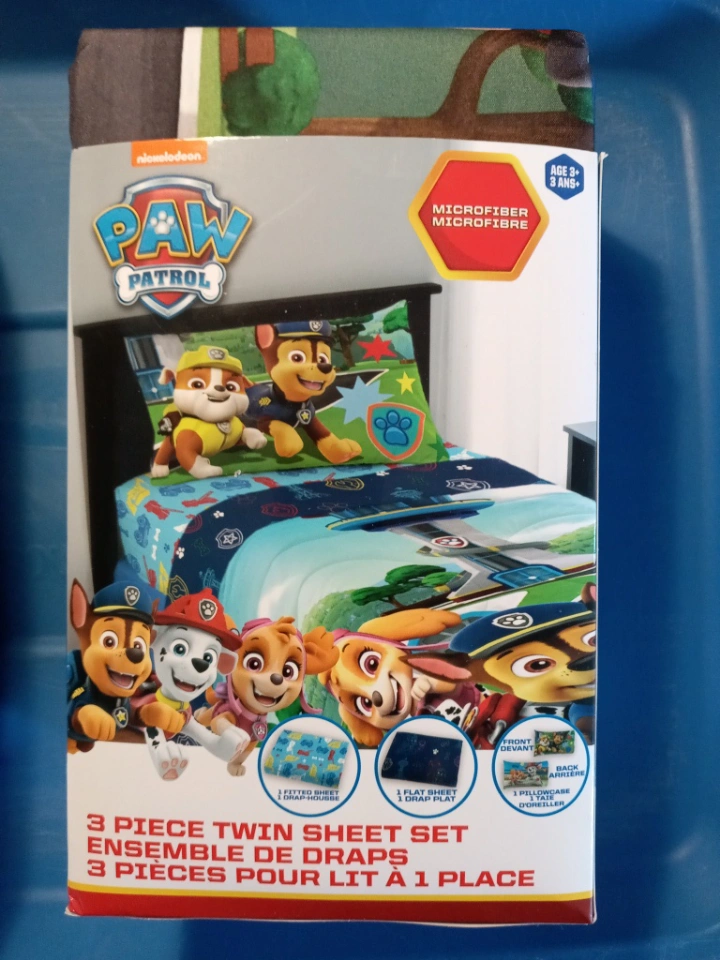 Selling a Brand New Paw Patrol 3-piece Twin Sheet Set! The set includes: - 1 fitted sheet - 1 flat sheet - 1 pillowcase It's made of soft microfiber and is suitable for ages 3+