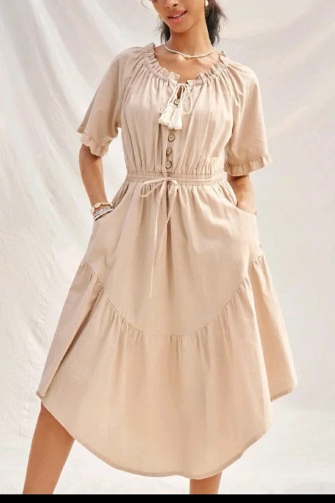 This cute beige dress features ruffle sleeves and a tiered design. It has a tie at the neckline with tassels and a cinched waist. Perfect for a casual day out