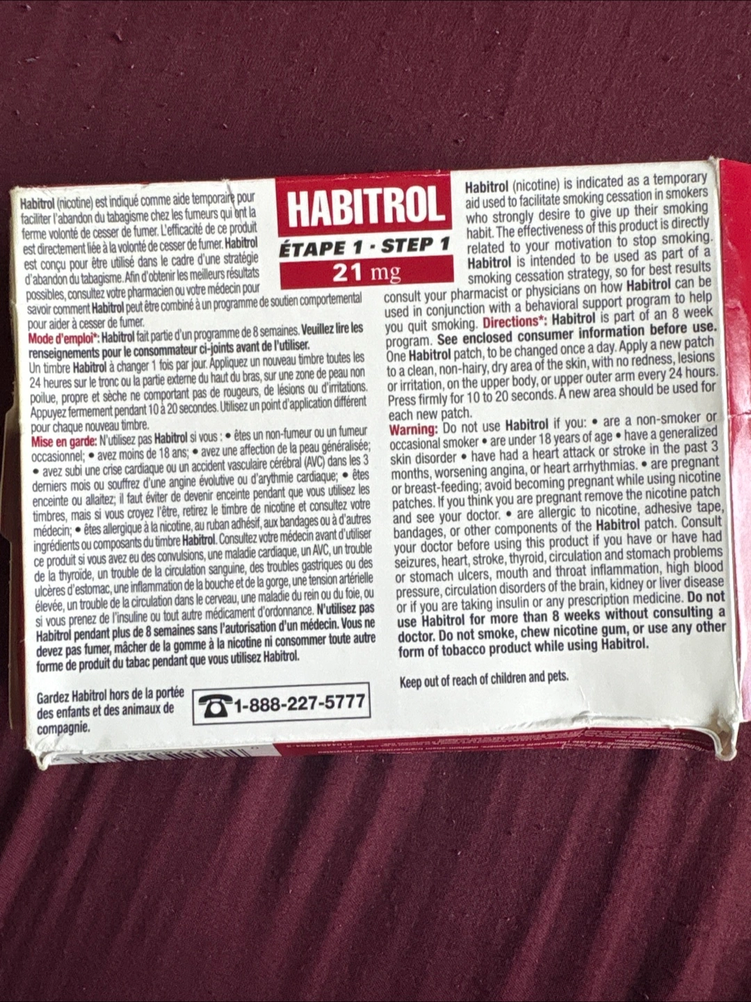 268Selling a box of Habitrol Step 1 nicotine patches (21mg). These patches are designed to help you quit smoking over an 8-week program. Each patch delivers 21mg of nicotine per day. The box indicates an expiry date of September 2025. If you're looking to quit, these might be just what you need!