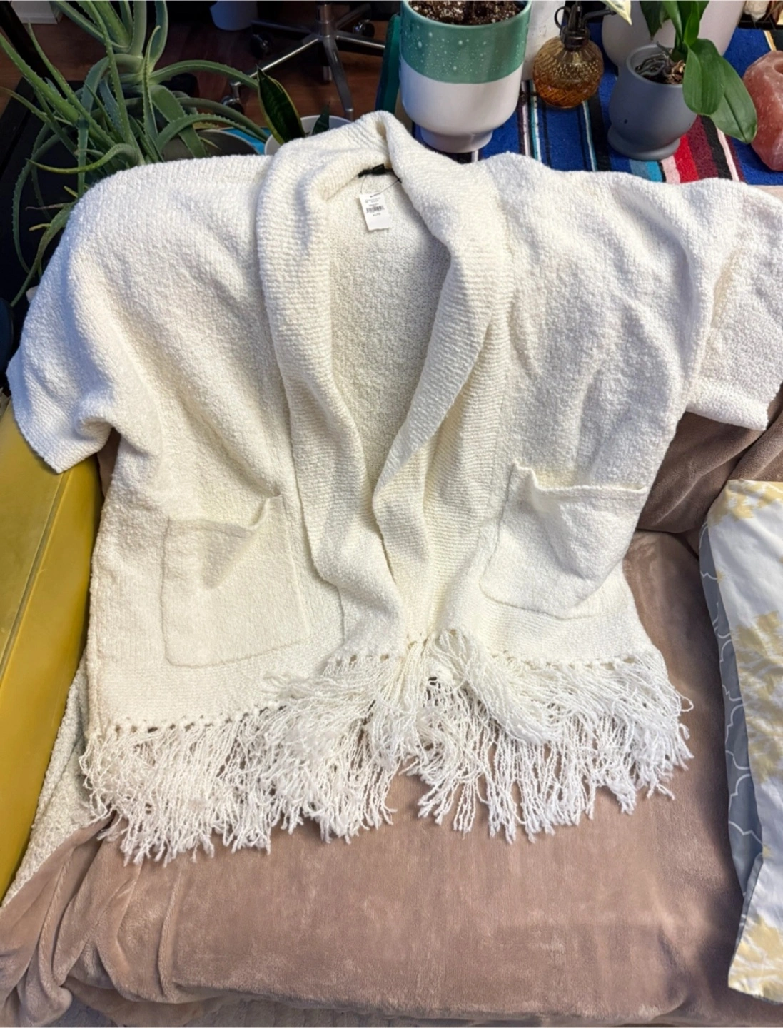 Selling a brand new Banana Republic white knit fringe cardigan in size XL! It features fringe detailing and pockets with an open front and relaxed fit