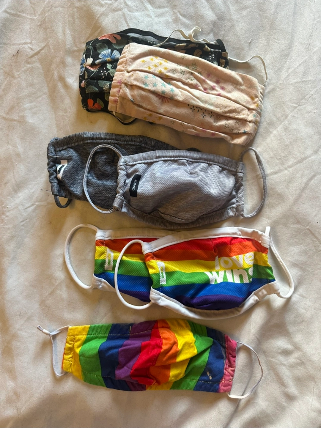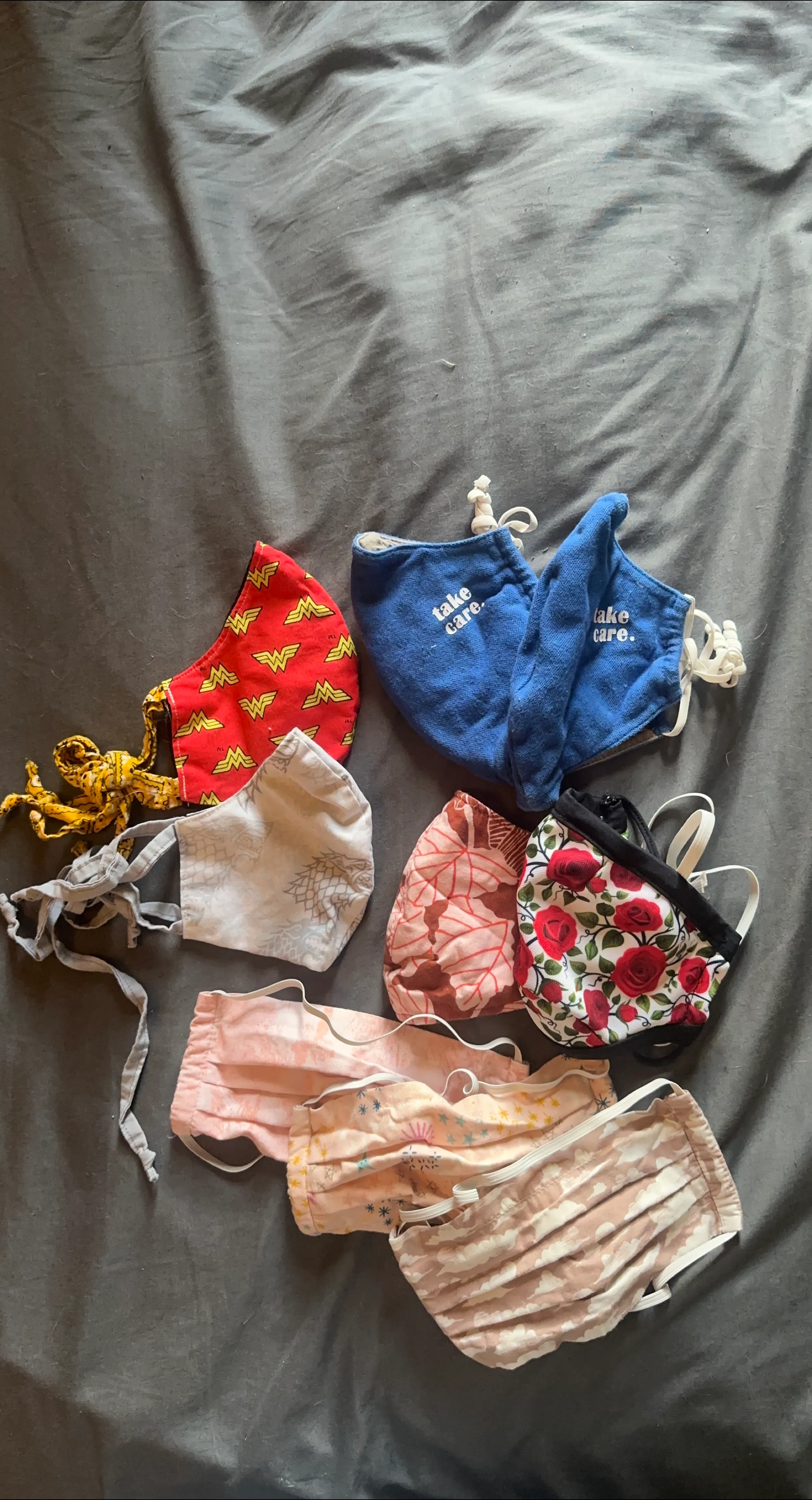 #freecycle 16 cute fabric face masks in various fabrics, patterns, and colours, plus 10 loose headstraps straps in various colours, as well as 5 plastic mask inserts