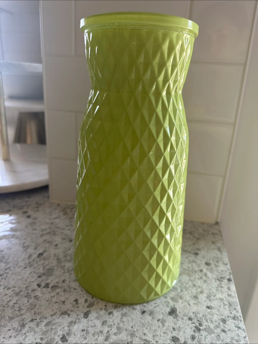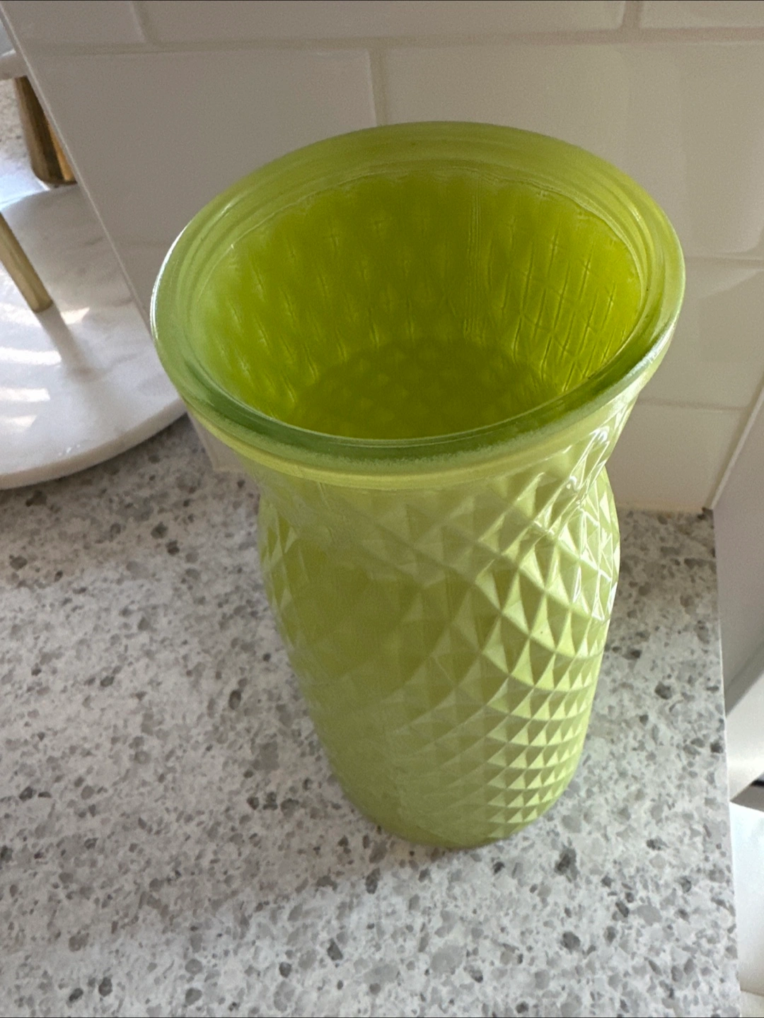 Selling a green glass vase. It would be perfect for displaying flowers or as a decorative piece in your home. It's in great condition and ready for a new home! (710 ml water bottle for reference).