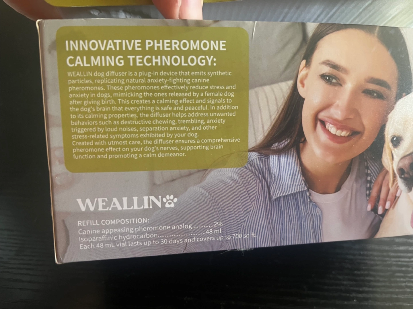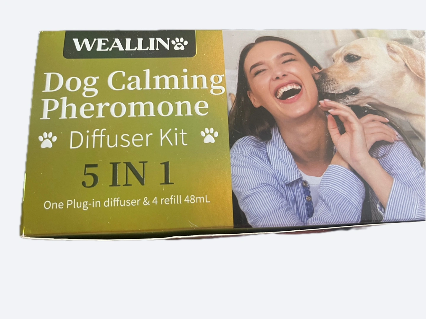 I'm selling a new WEALLIN Dog Calming Pheromone Diffuser Kit! This 5-in-1 kit includes one plug-in diffuser and four 48mL refills. The diffuser emits synthetic particles that replicate natural anxiety-fighting canine pheromones, helping to reduce stress and anxiety in dogs. It creates a calming effect and signals to the dog's brain that everything is safe and peaceful. Each 48mL vial lasts up to 30 days and covers up to 700 sq ft