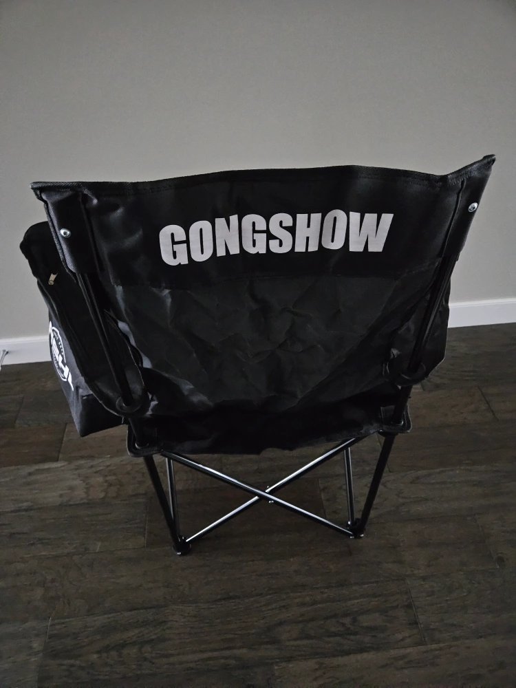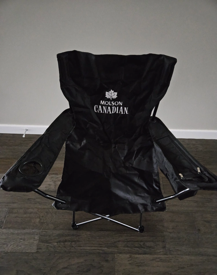 Selling a black folding camp chair by Molson Canadian & Gongshow! It's in great shape and perfect for camping, picnics, or just relaxing in the backyard. It also comes with a convenient gongshow carrying bag for easy transport and storage and a cooler bag on the arm of the chair.