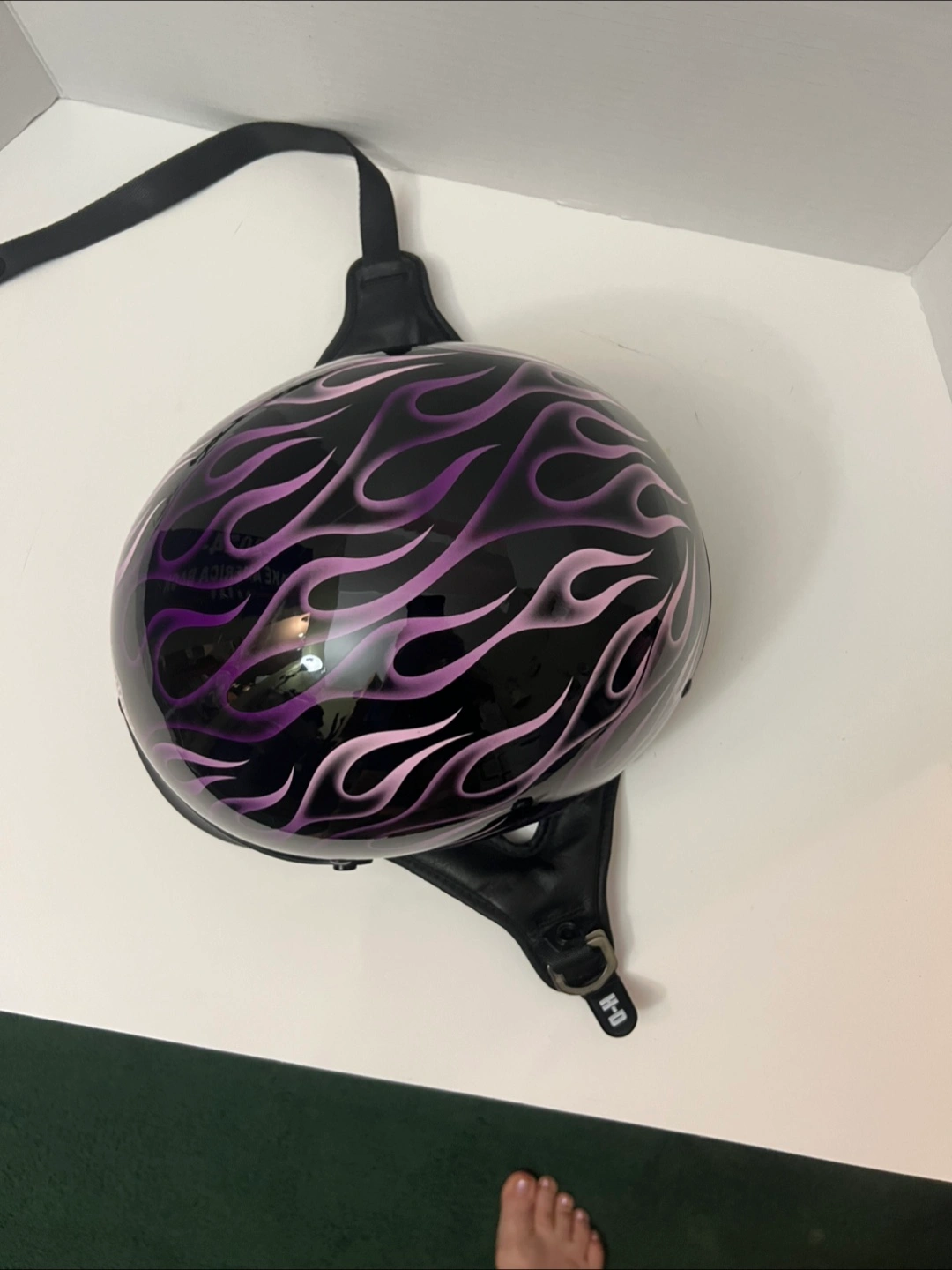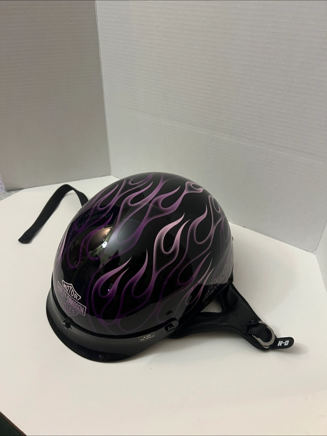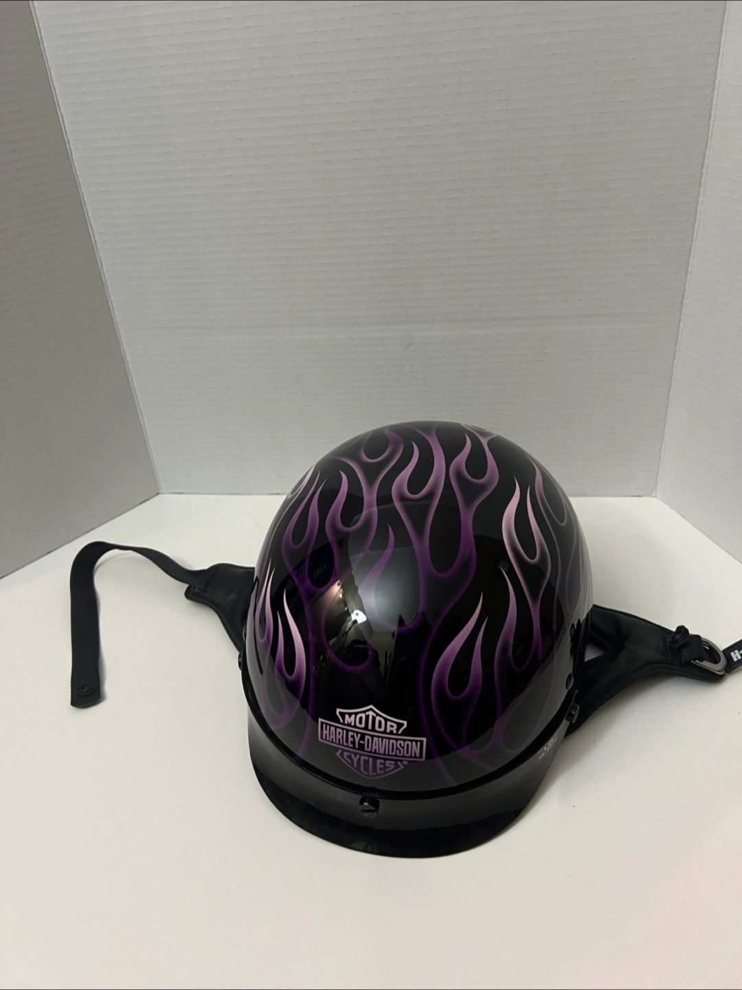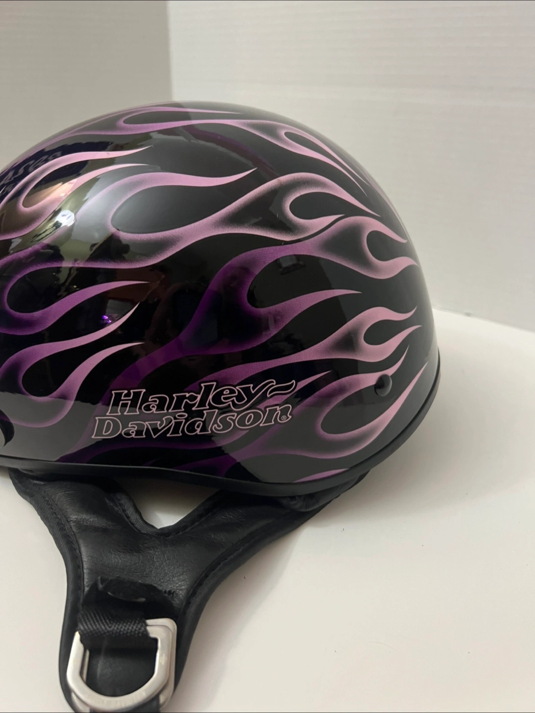 Selling my a genuine Harley-Davidson motorcycle helmet with a cool purple flame design! It has the Harley-Davidson logo on the sides and a DOT sticker. Ready for your next ride!