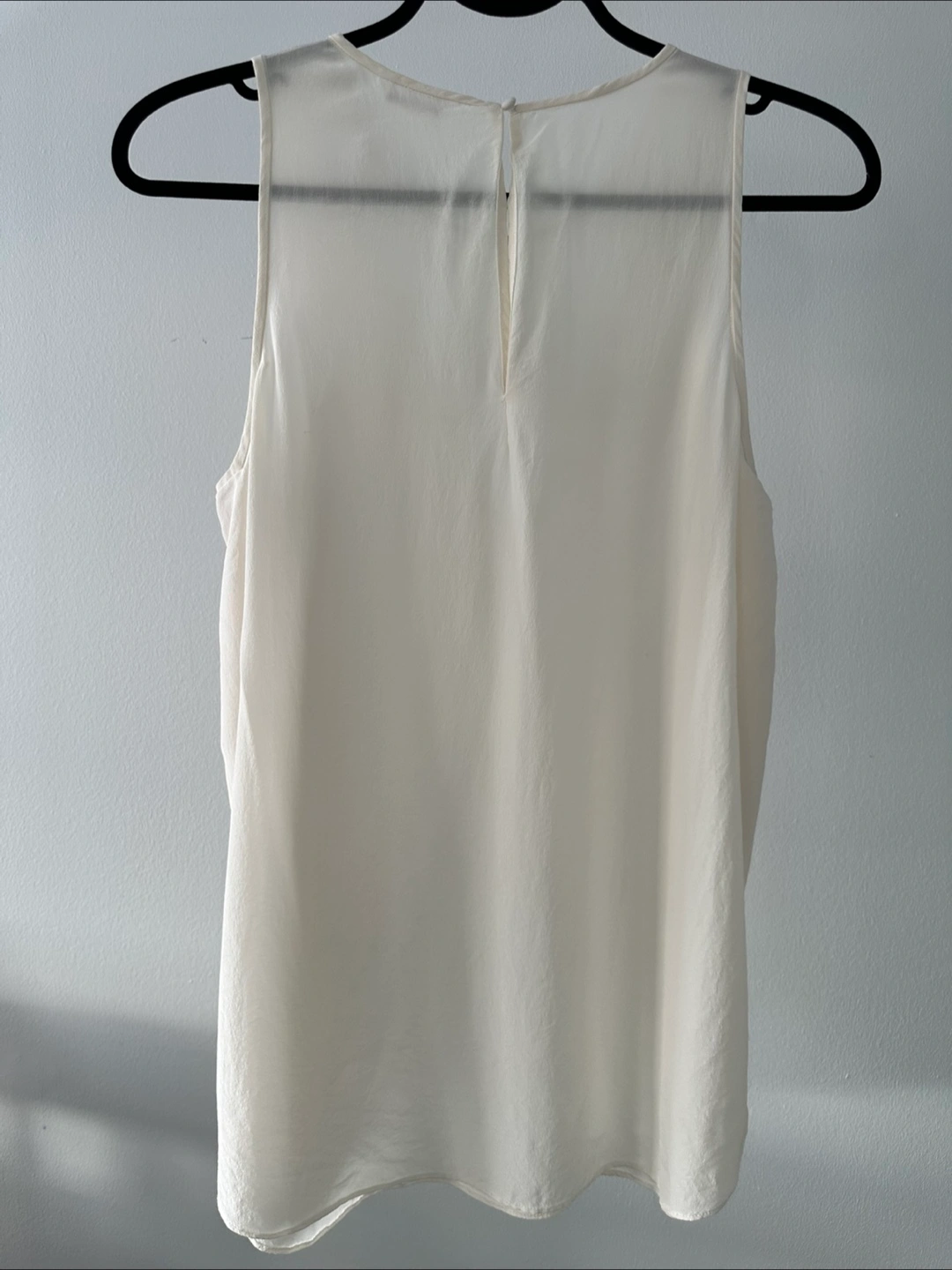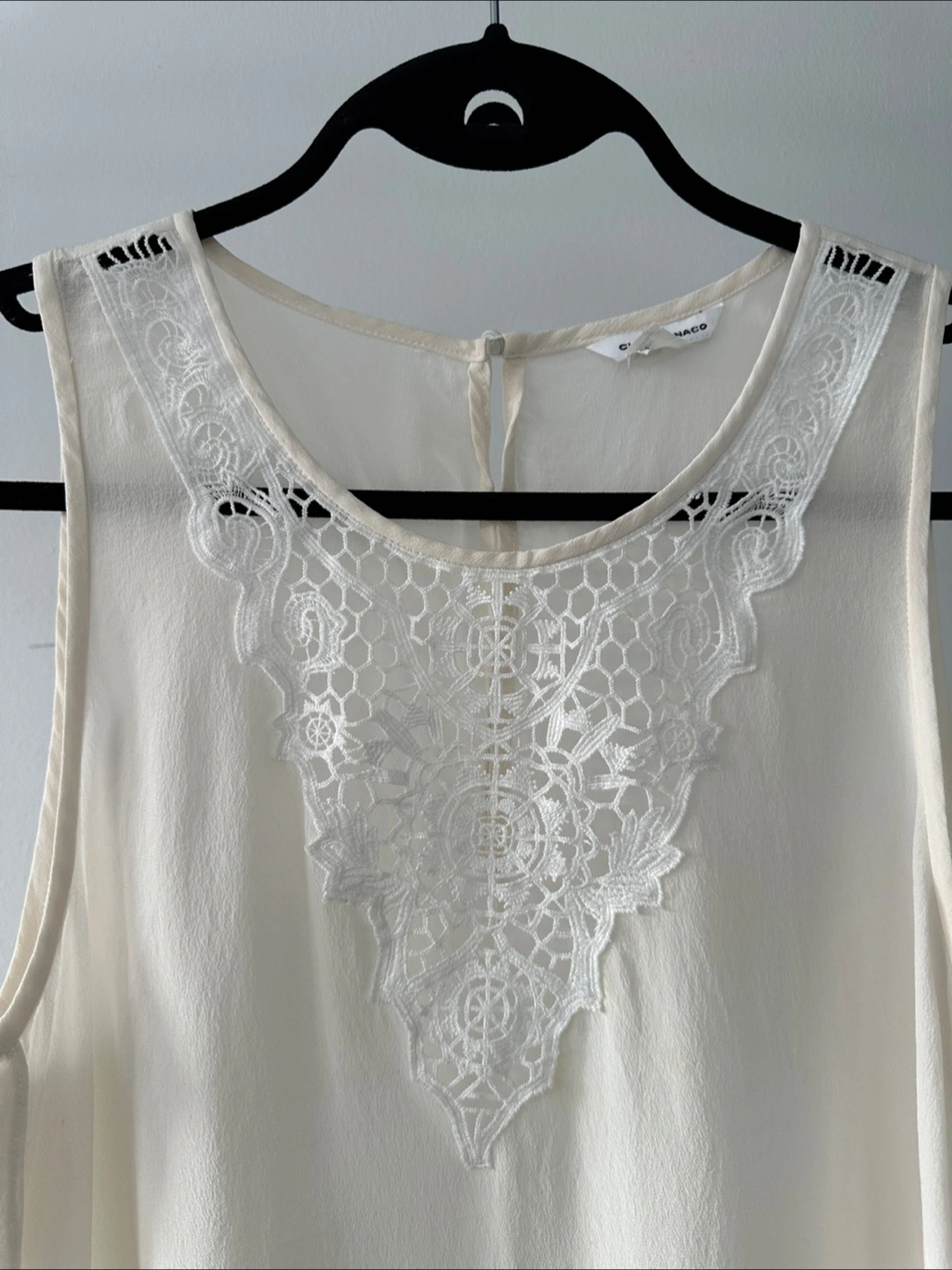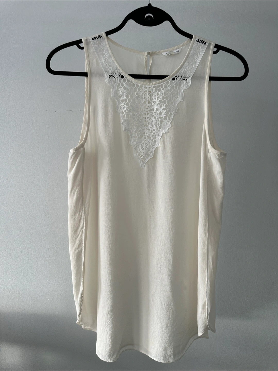 564Selling a 100% silk cream-coloured sleeveless blouse from Club Monaco in size small. It features a delicate lace detail around the neckline. Perfect for dressing up or down!