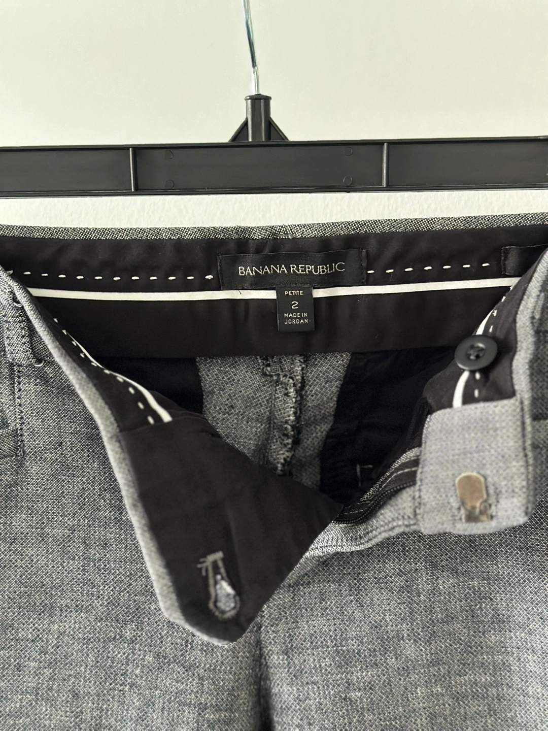 These are a stylish pair of Banana Republic pants in a lovely gray colour. They are size 2 petite, perfect for a smaller frame. They are in great condition and ready for a new home!