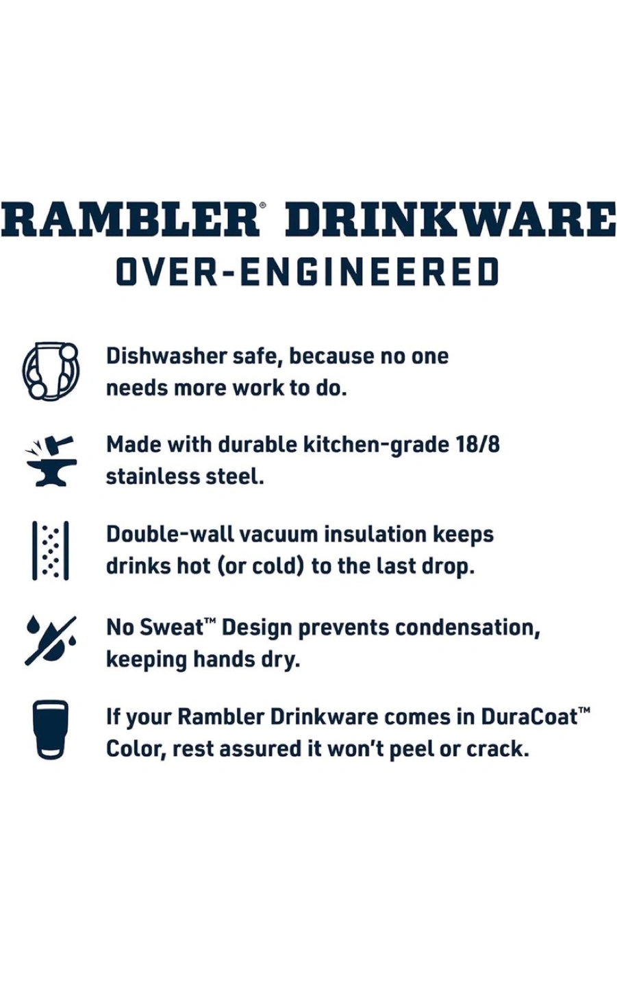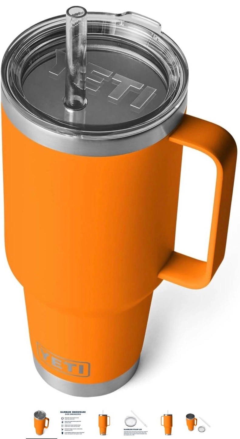 Keep your drinks hot or cold for hours with this YETI Rambler mug! It's a 42 oz mug in a vibrant orange colour. It comes with a straw lid and a straw. The double-wall vacuum insulation keeps drinks hot (or cold) to the last drop, and the No Sweat™ design prevents condensation, keeping hands dry