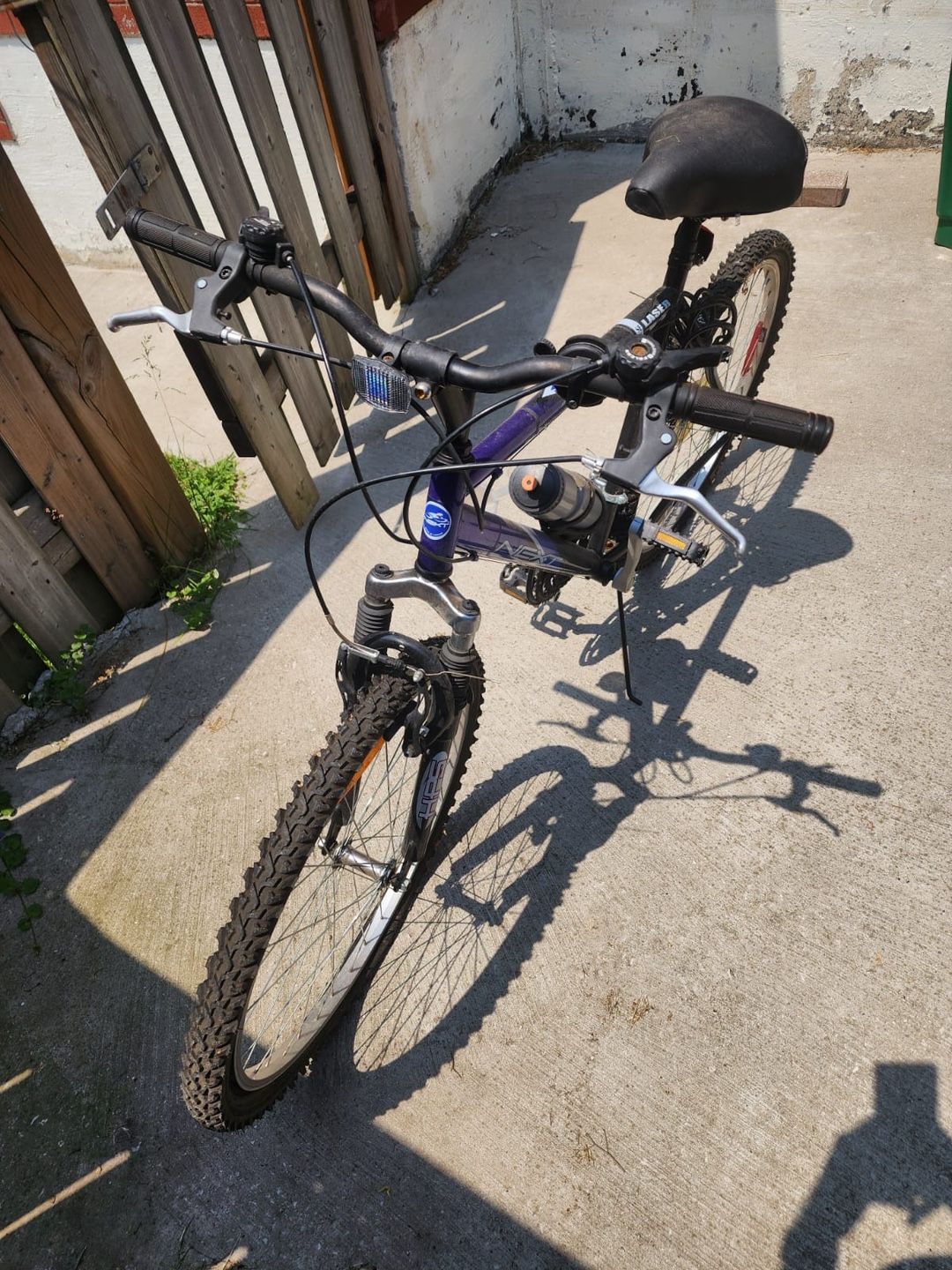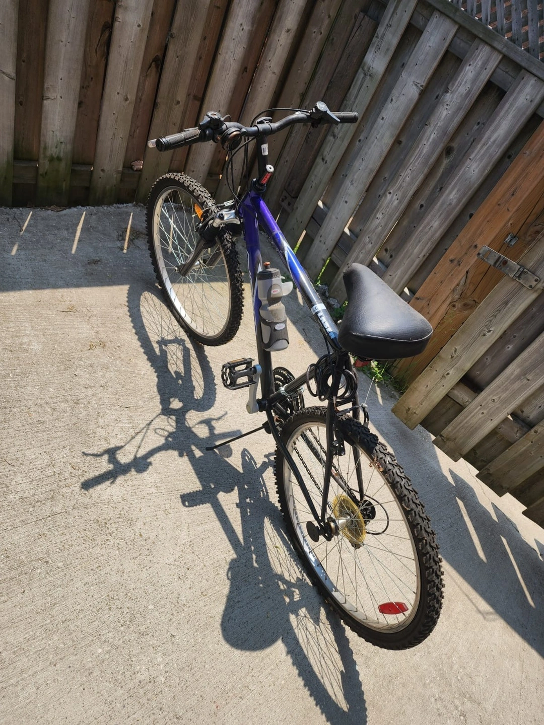 Selling a mountain bike in blue and black. It's in good condition and ready for some outdoor adventures! It comes with a water bottle holder.