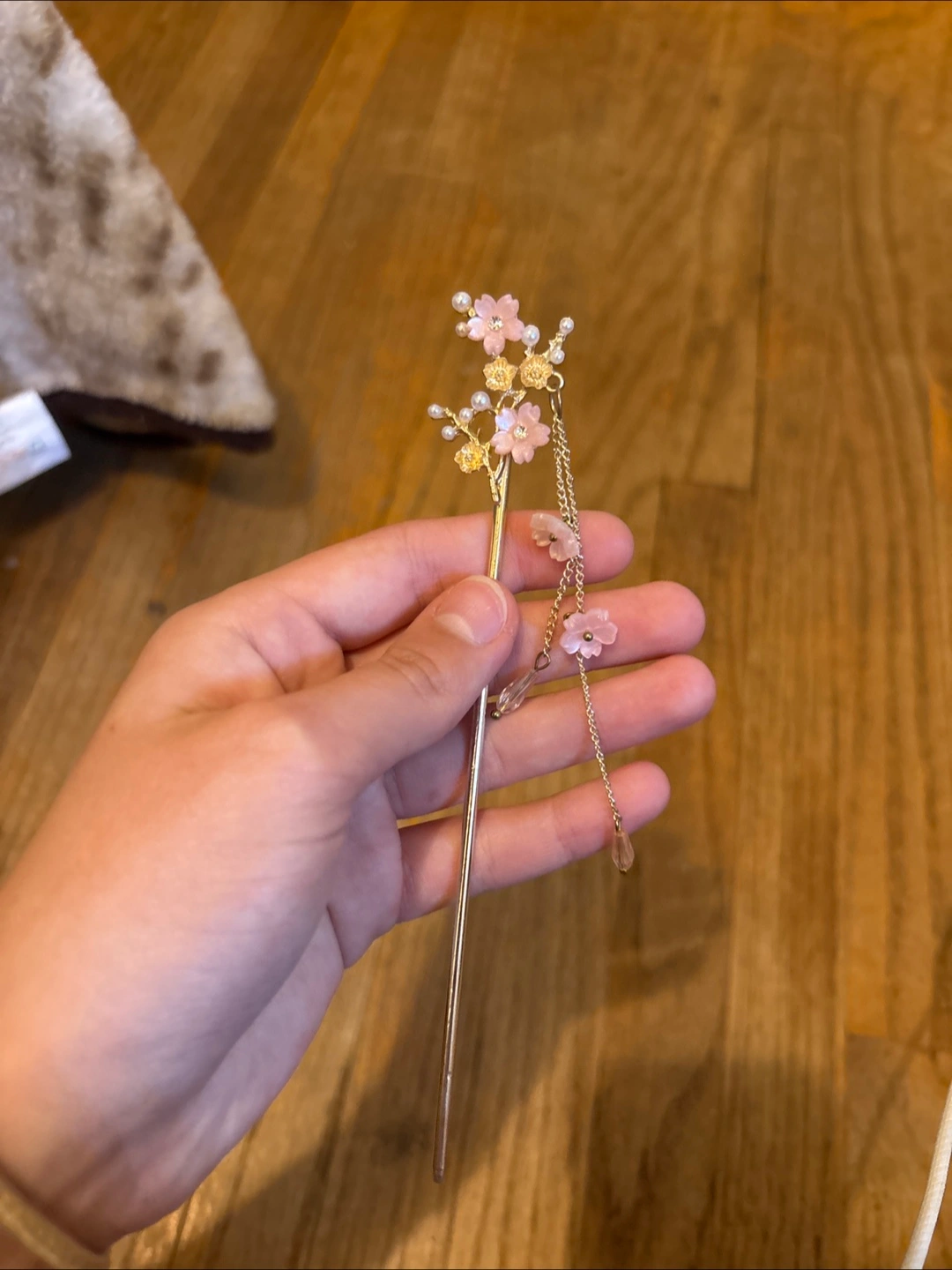 Selling a cute floral hair stick! It has a delicate chain with little beads. The flowers are a pretty pink colour with pearl accents. Perfect for adding a touch of elegance to your hairstyle
