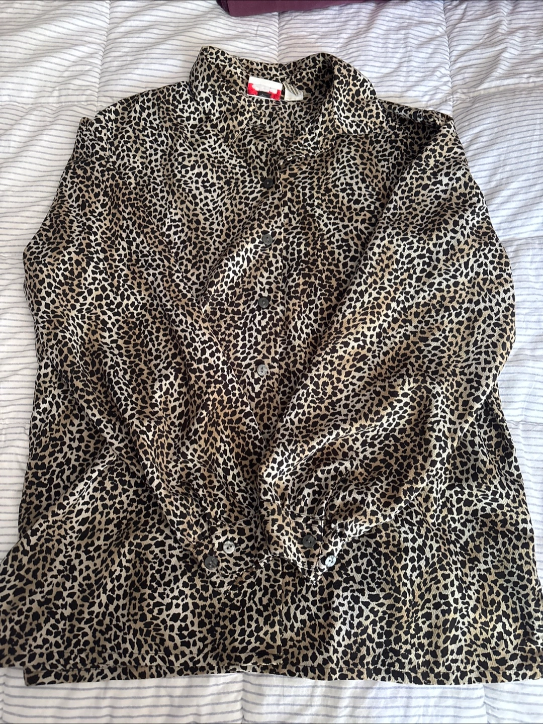 button-up shirt with a fun leopard print! It's perfect for adding a bit of flair to your wardrobe. Great for layering or wearing on its own