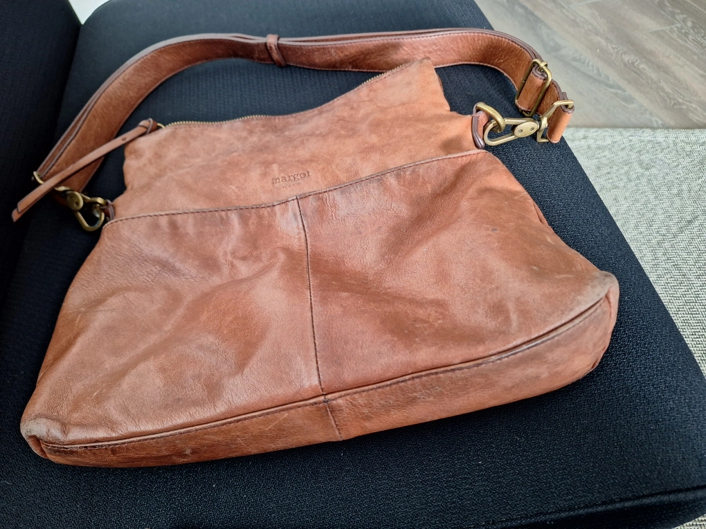 Used Margot New York brown leather shoulder bag. It has a zipper closure and a lined interior with pockets. Perfect for everyday use!