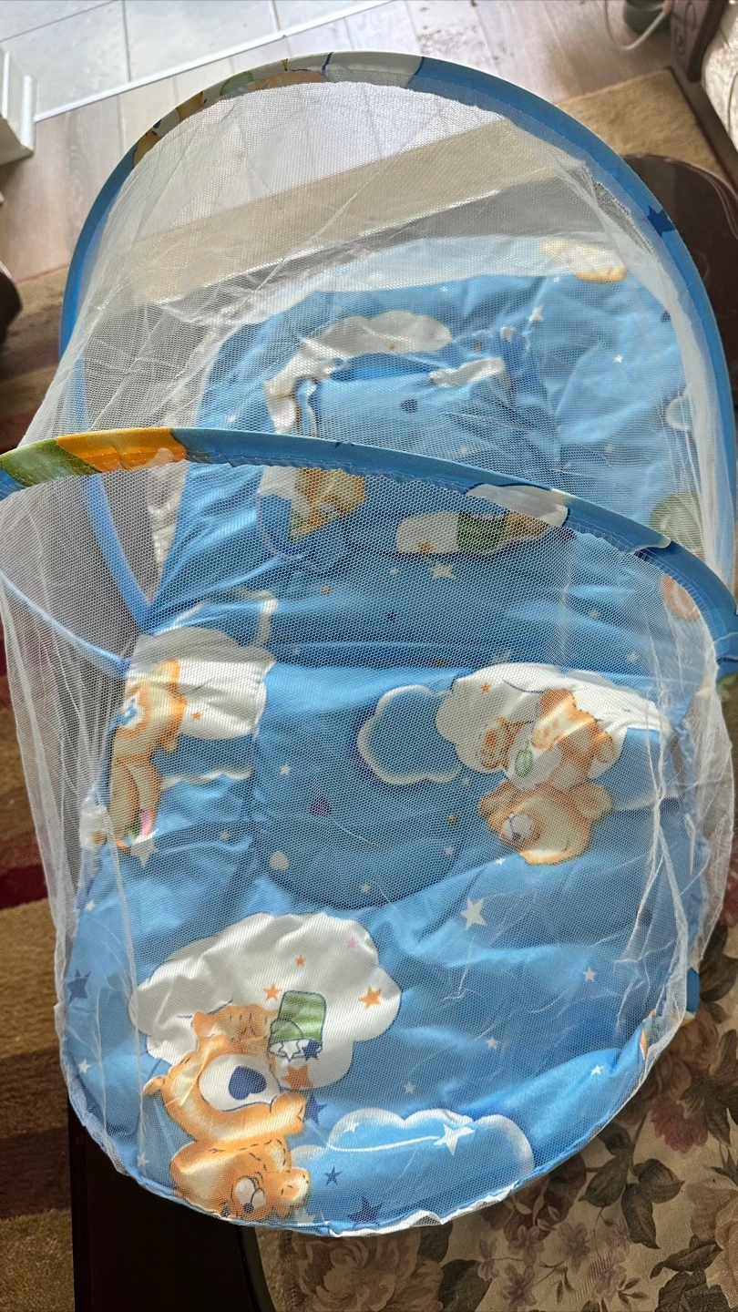 Here's a baby mosquito net bed in great condition! It's perfect for keeping your little one safe from bugs while they sleep. The bed features a cute blue design with teddy bear patterns