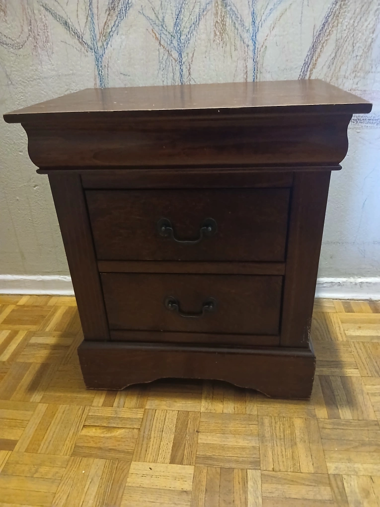 Selling a brown wooden nightstand featuring two small drawers. It's perfect for adding a touch of classic style to your bedroom!