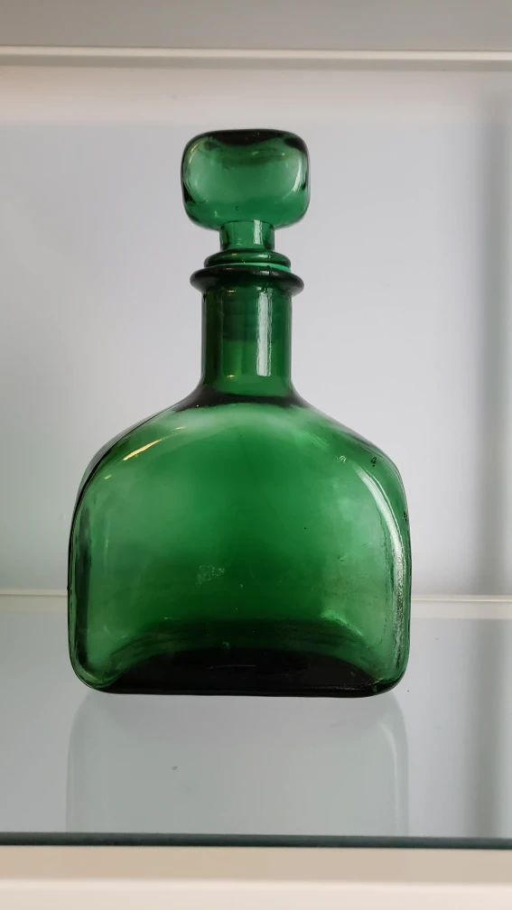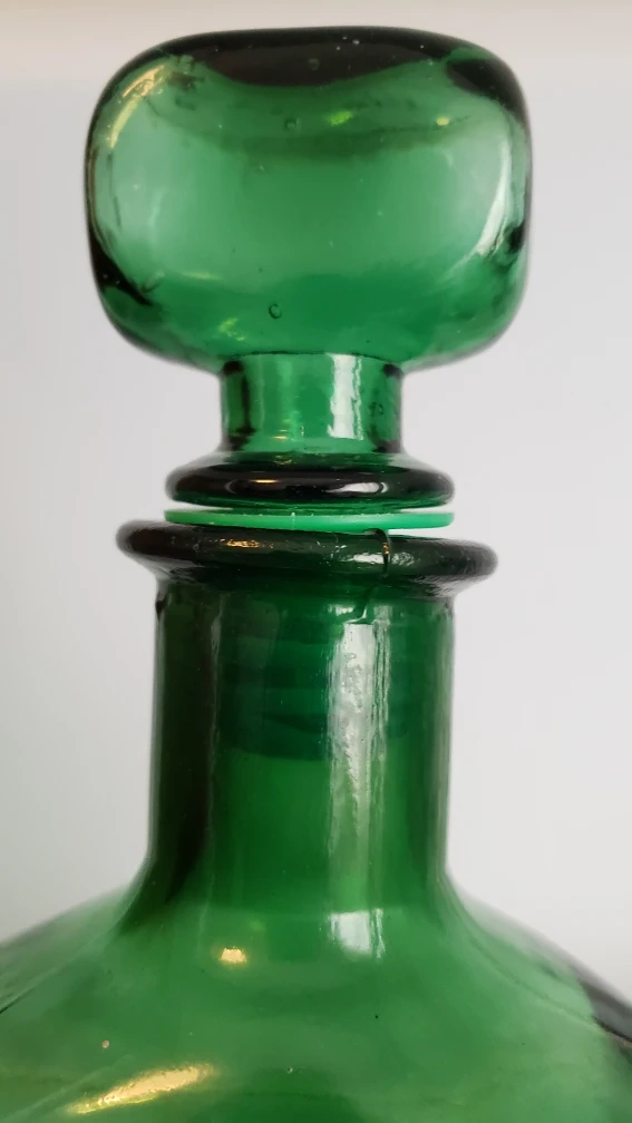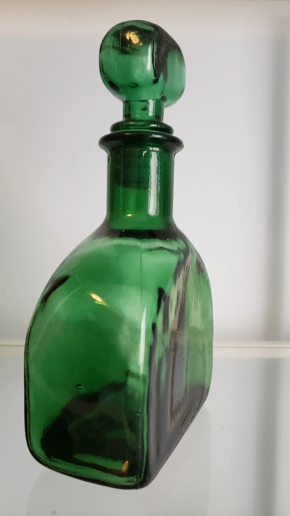 Here's a beautiful vintage green glass decanter! It would make a lovely addition to any home bar or collection. The glass is a rich, deep green, and the stopper fits snugly. It's in great condition for its age, with no chips or cracks that I can see