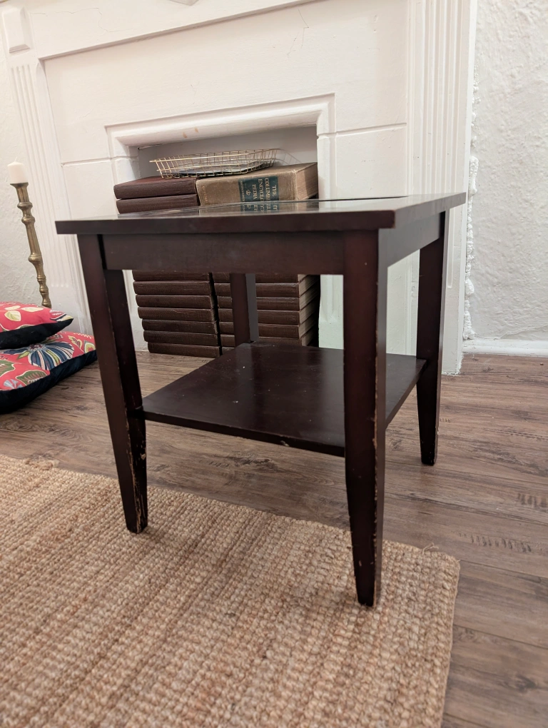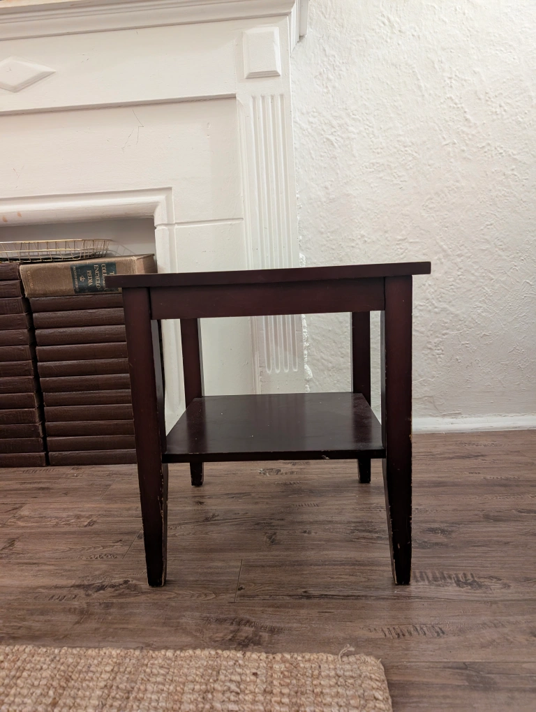 A cute dark brown end table with a shelf, perfect for a living room or bedroom! It has a square shape and is in good condition, with some minor signs of wear on the legs as shown in the pictures. Great for holding lamps, books, or decorations
