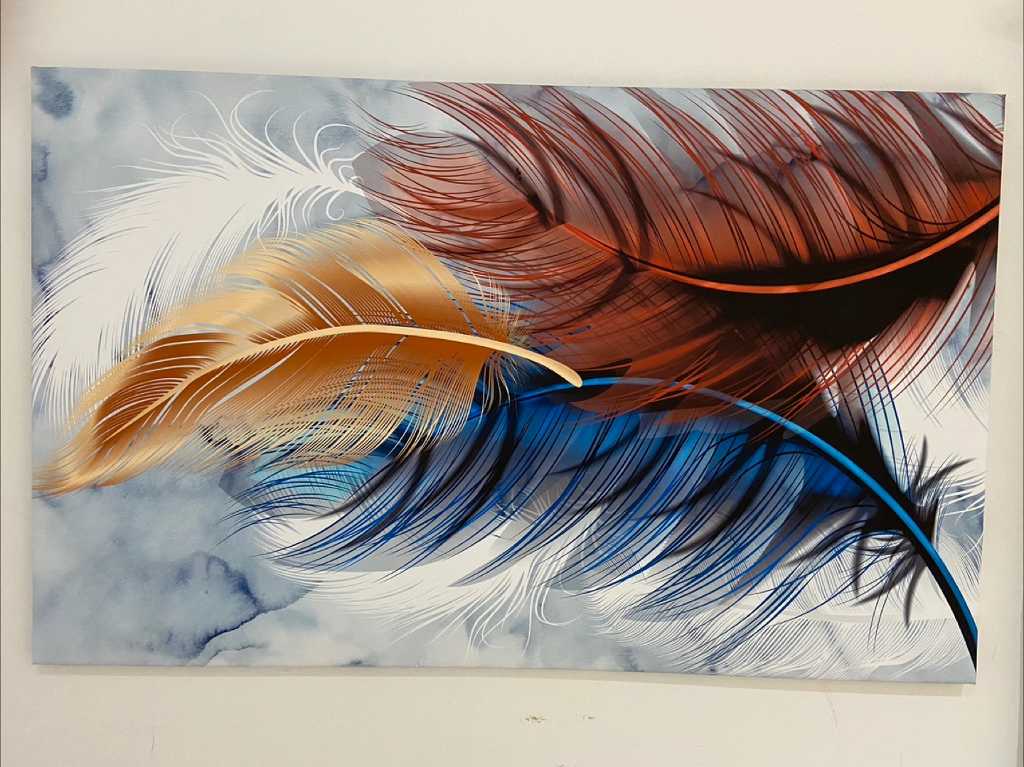 I'm selling a beautiful piece of wall art featuring a feather print. It adds a touch of elegance to any room. The colours are vibrant and eye-catching, making it a great focal point for your space