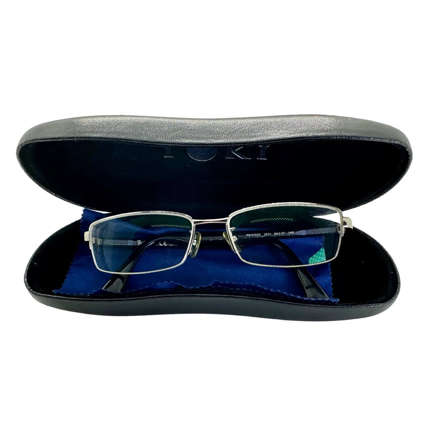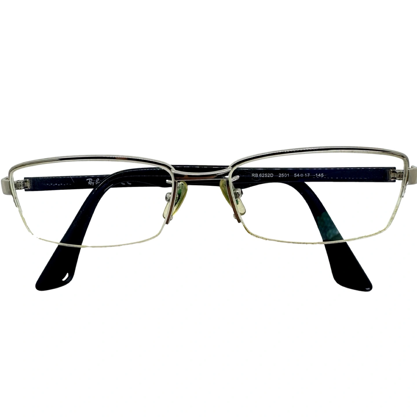 Selling a pair of Vintage Half Rim Silver Blue Metal Ray-Ban glasses, model RB 6252D-2501. Come with case and cleaning cloth. Unisex. They are in good condition and ready for a new home! The size is 54-17-145.