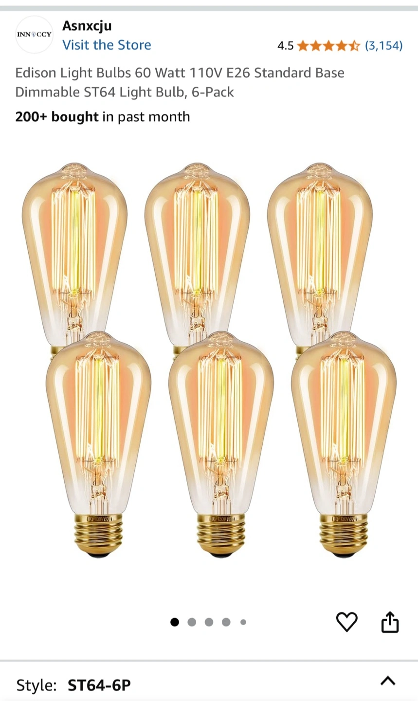 Selling a 6-pack of Asnxcju Edison light bulbs! They're 60 Watt, 110V E26 standard base, and dimmable. Originally bought for $19.99. All working well