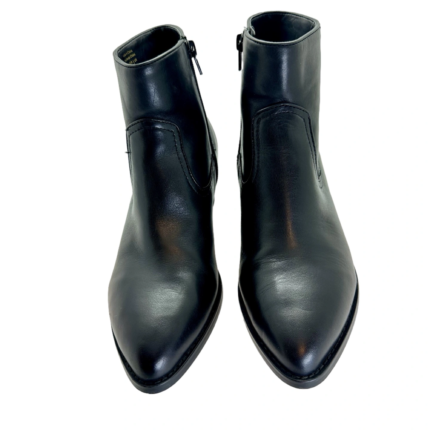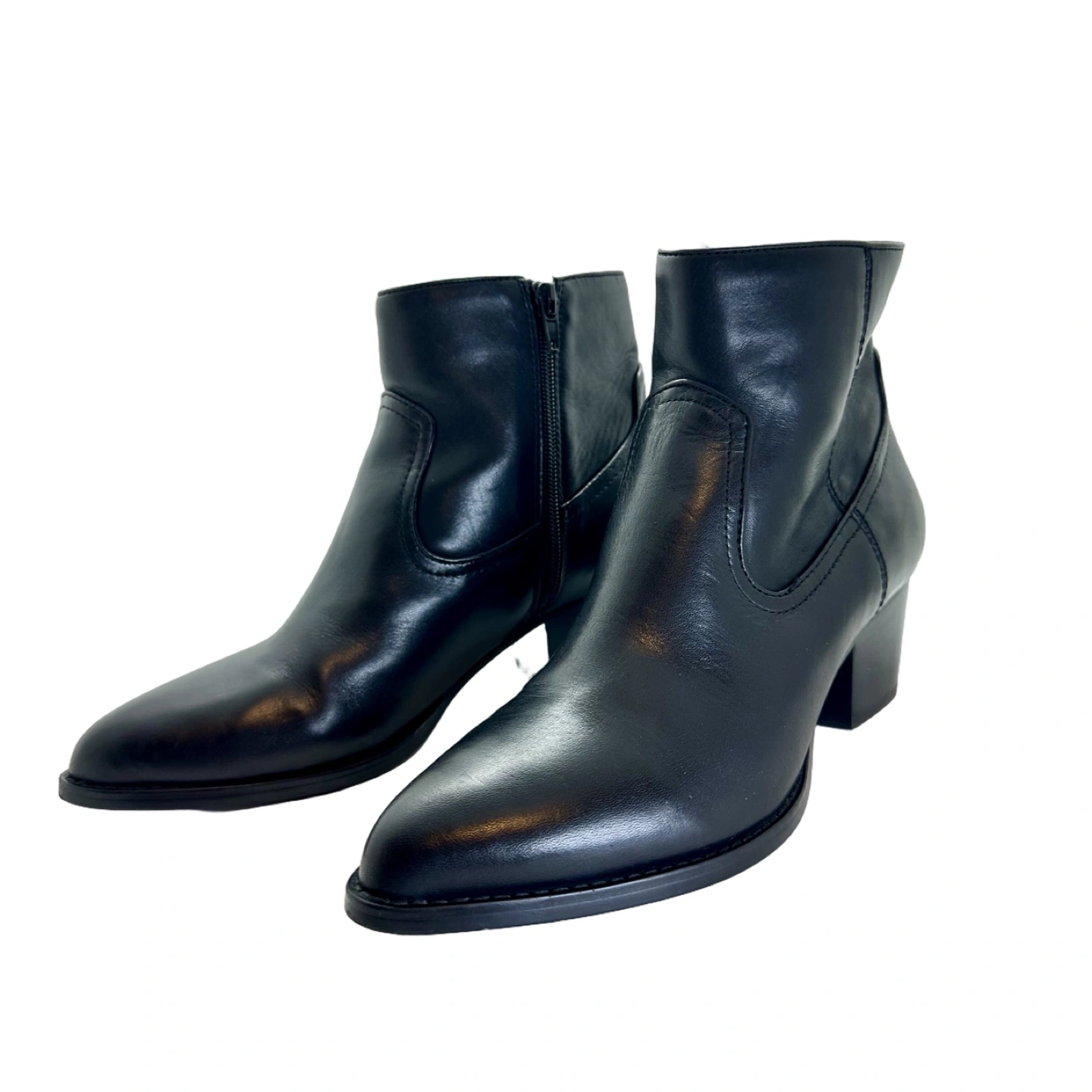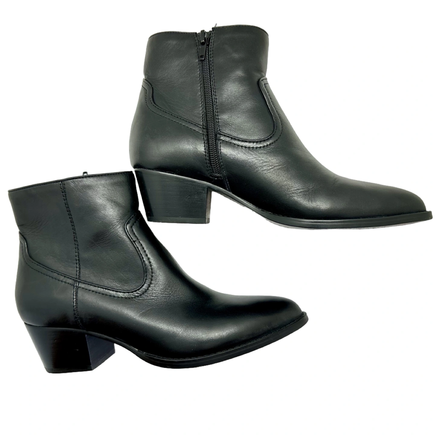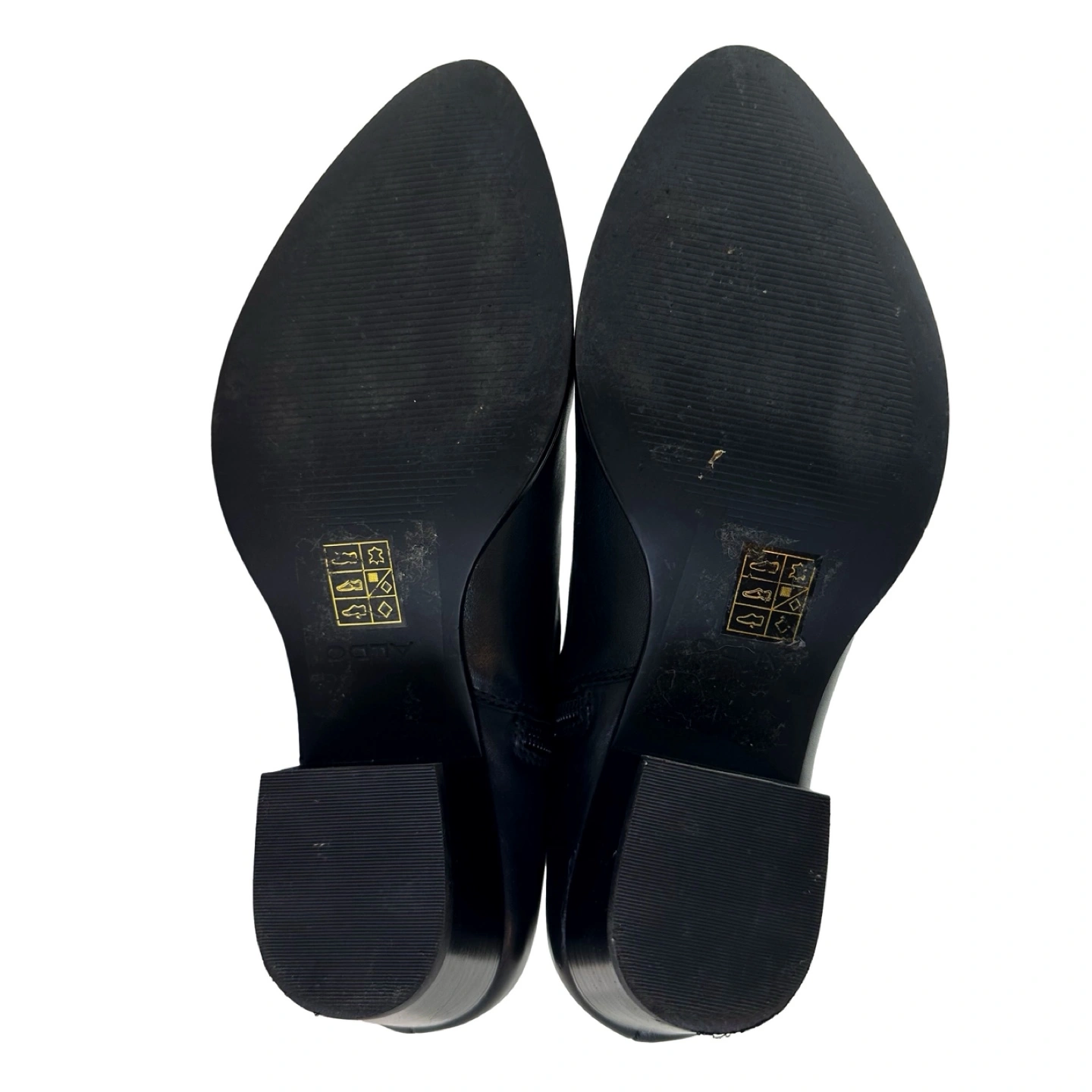 These are a pair of Aldo black leather heeled ankle boots in a women's size 8.5. They feature a pointed toe and a side zipper.
