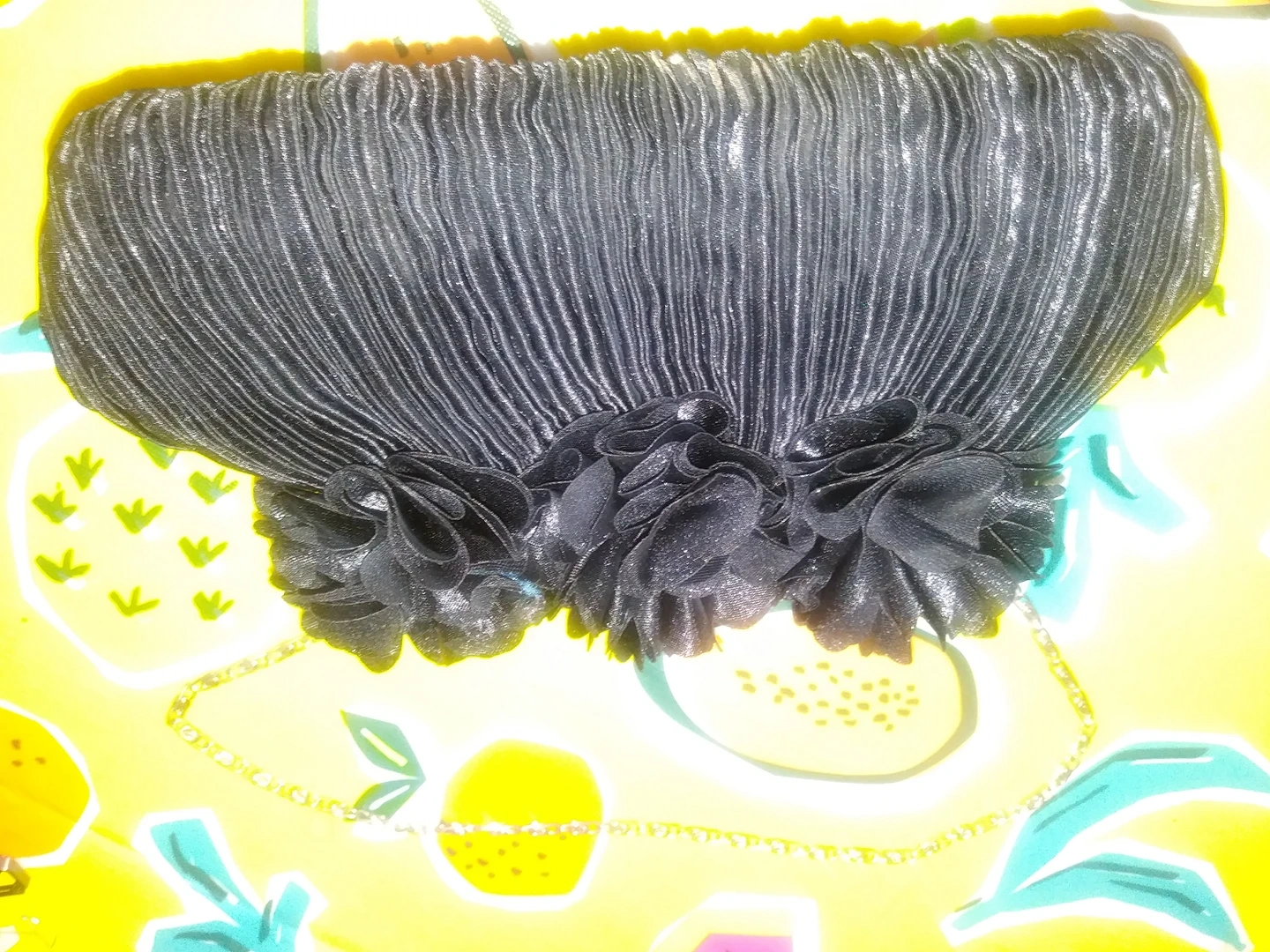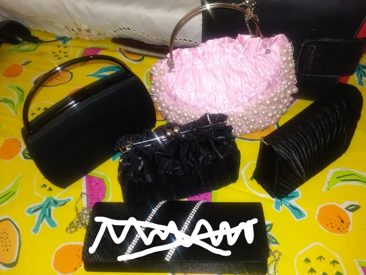 These bag all come with carrying chain. Black bags, except for one with flowers, are made with hard material; perfect for normal or party use. Perfect match with night gown. Some of these had never been used, others are lightly used.