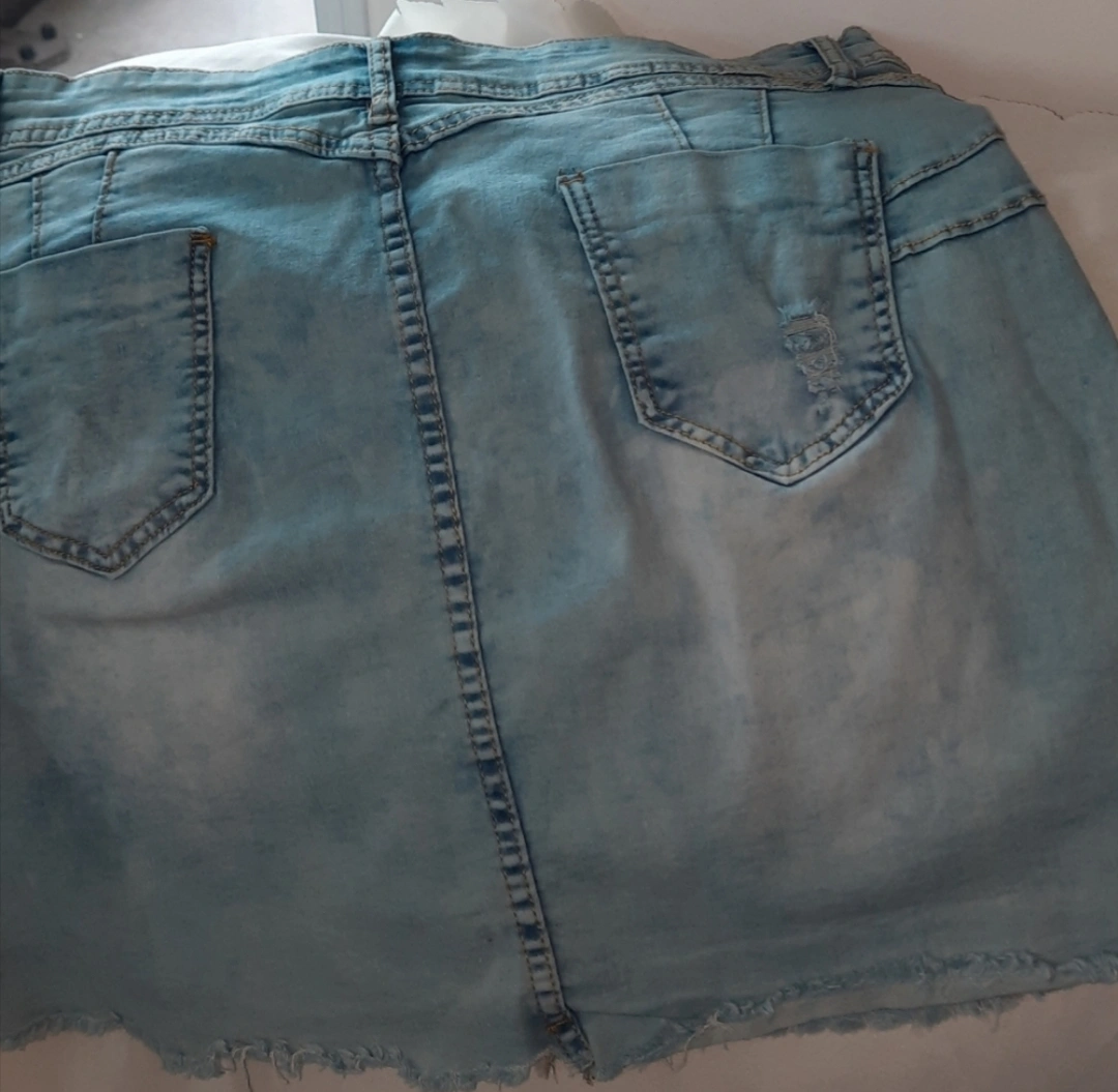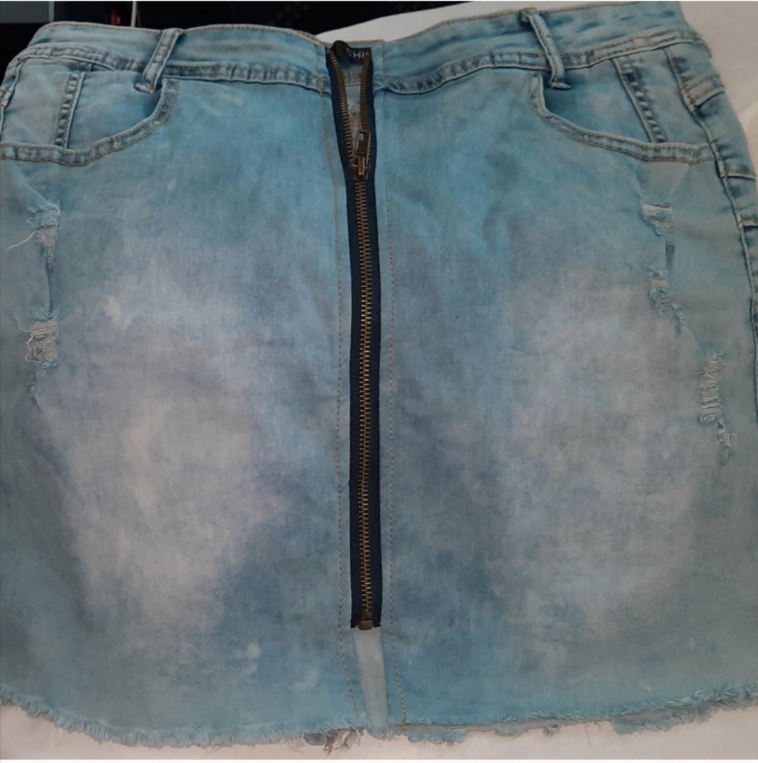 Here's a cute denim mini skirt! It's a light blue wash with a zipper down the front. It has a bit of a distressed look with some fraying on the bottom hem.