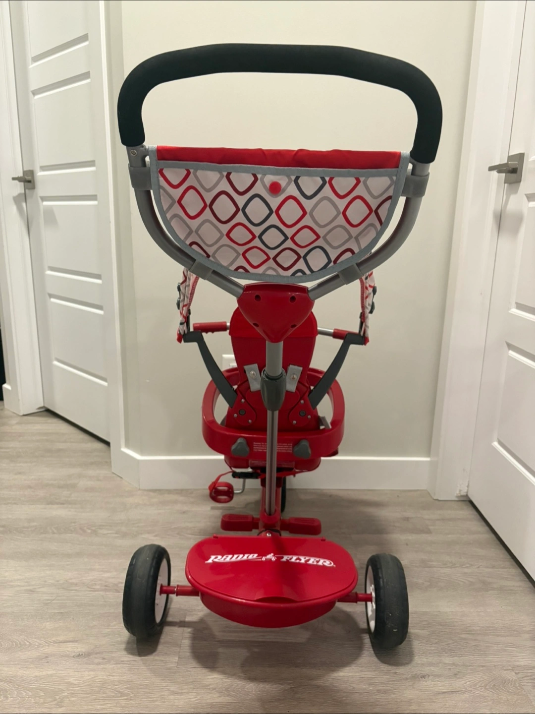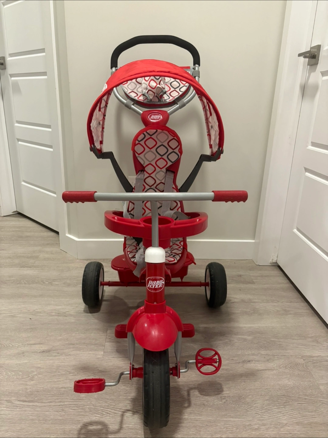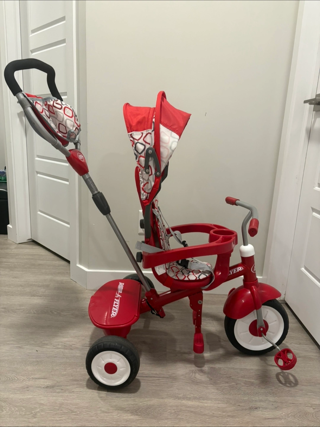 140Selling a Radio Flyer Steer & Stroll Trike in great condition! It's perfect for little ones learning to ride. The trike features a sturdy build and a convenient parent steering handle. The seat cover, sunshade and handle compartment to carry items are all removable and washable. Has a small storage compartment along the back wheels also. Ready for a new home! Used by one child a handful of times. Well taken care of and kept clean. Natural wear and tear only visible on the tires No smoking, no pets, no stains