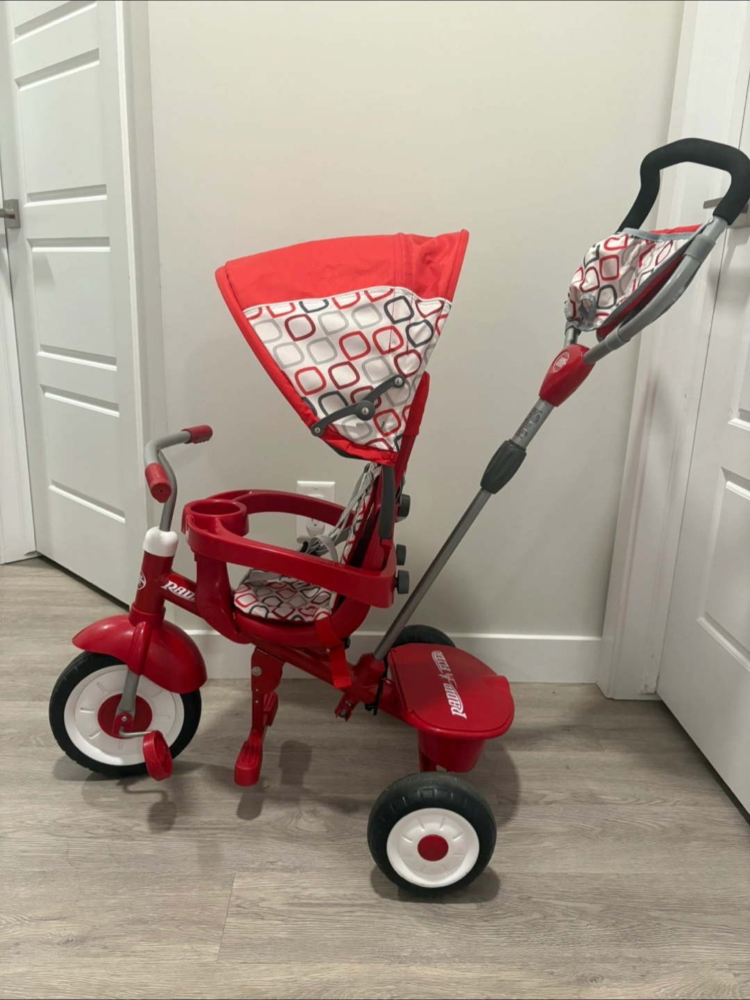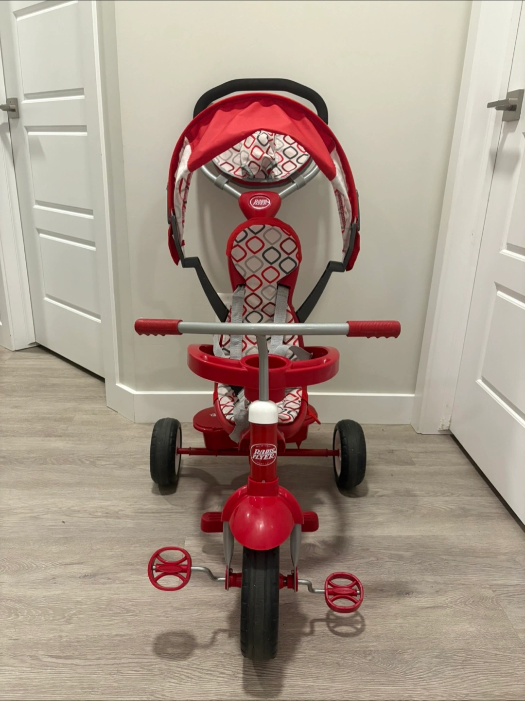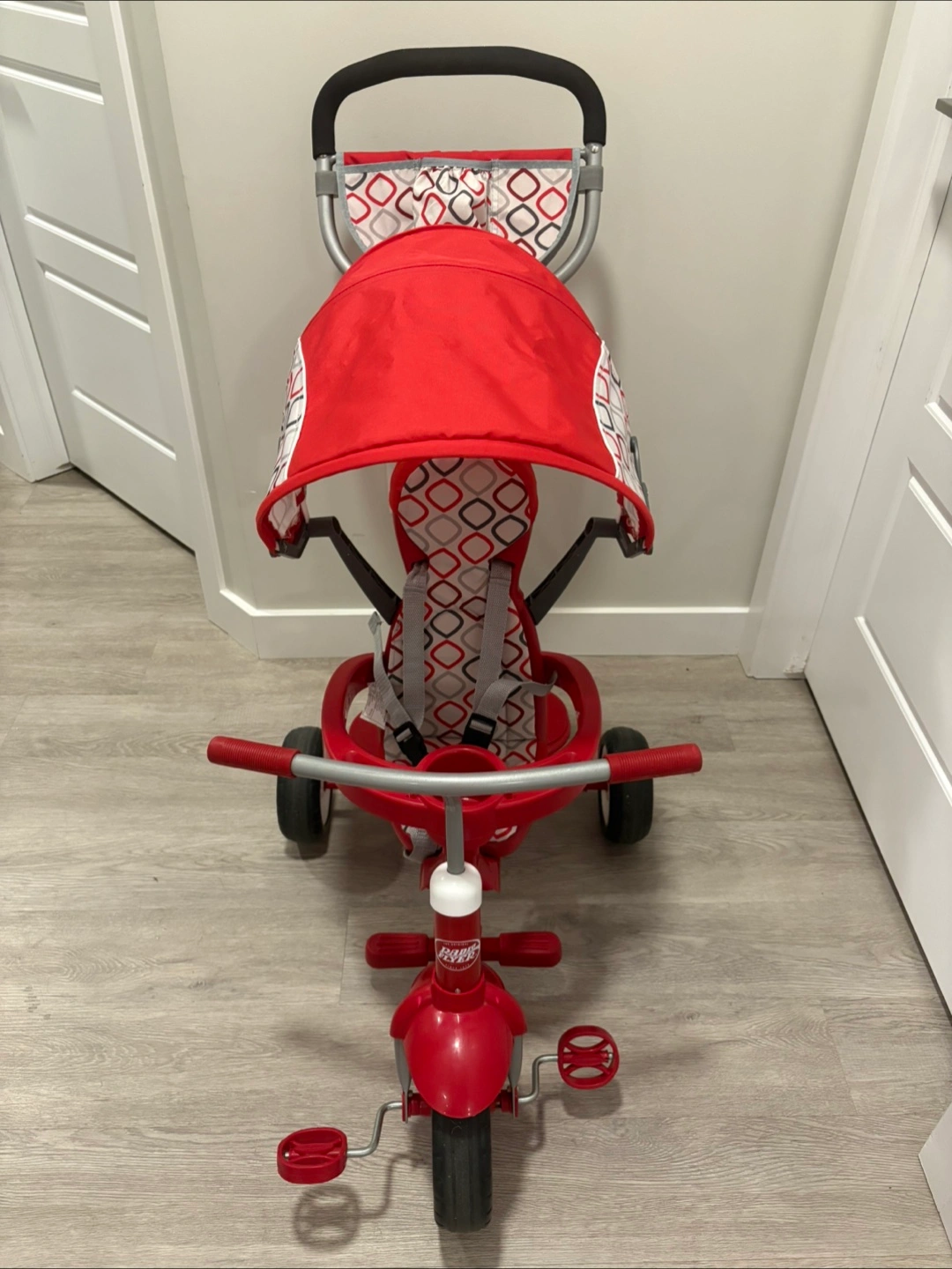 140Selling a Radio Flyer Steer & Stroll Trike in great condition! It's perfect for little ones learning to ride. The trike features a sturdy build and a convenient parent steering handle. The seat cover, sunshade and handle compartment to carry items are all removable and washable. Has a small storage compartment along the back wheels also. Ready for a new home! Used by one child a handful of times. Well taken care of and kept clean. Natural wear and tear only visible on the tires No smoking, no pets, no stains