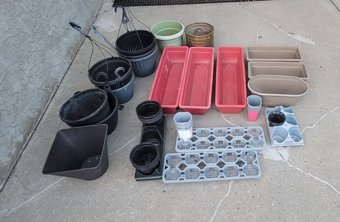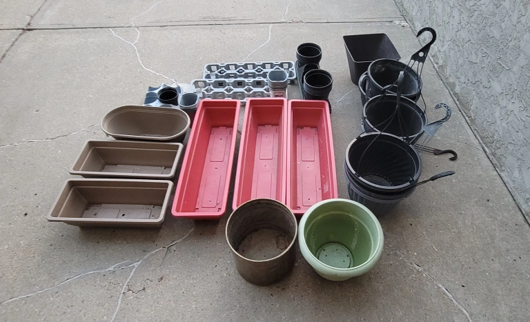 6 and 8" nursery pots, hanging planters, round pots and rectangular window boxes in all shapes and sizes. They've been washed and are in excellent condition.