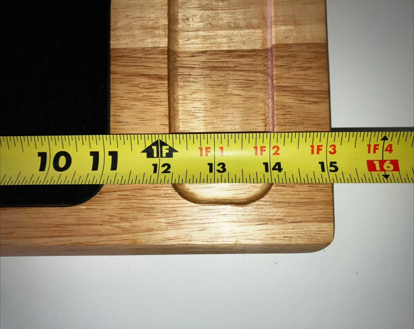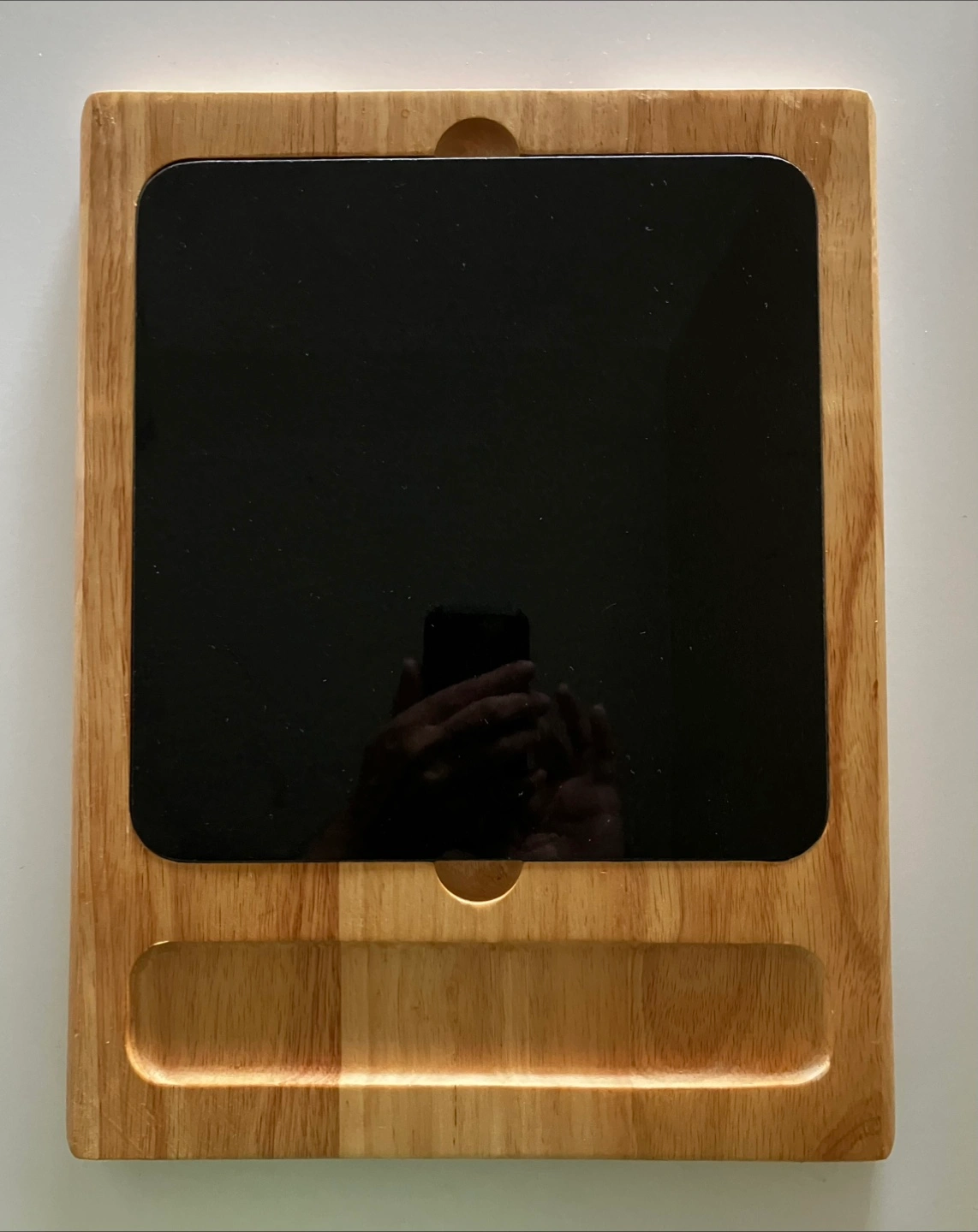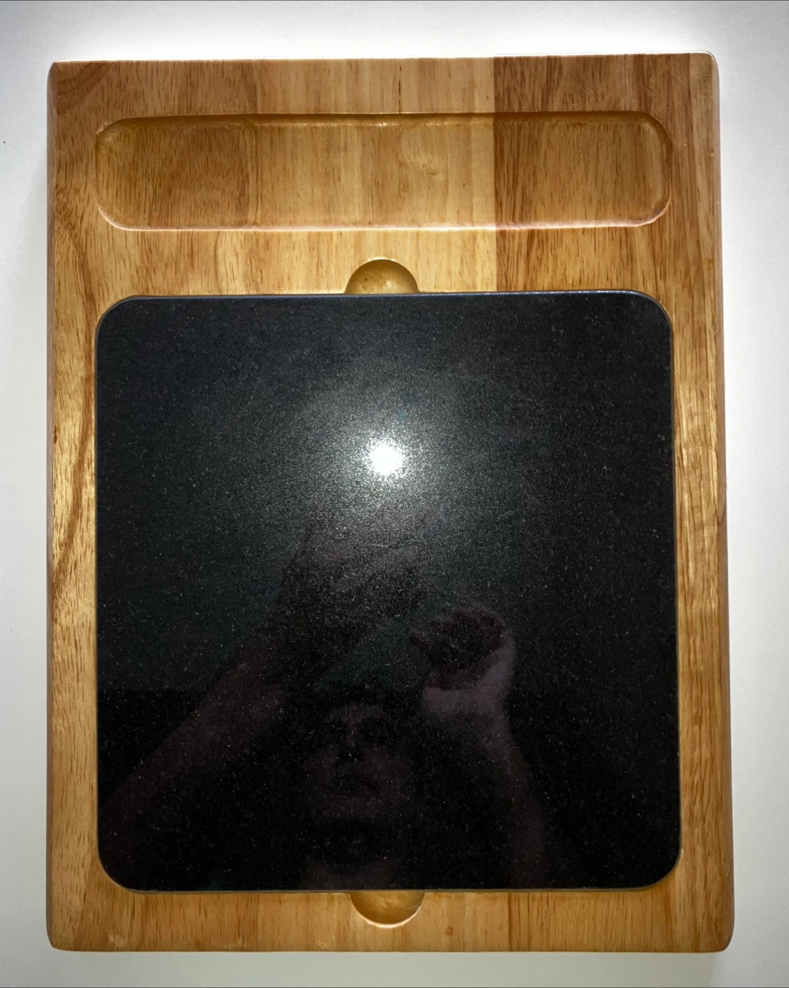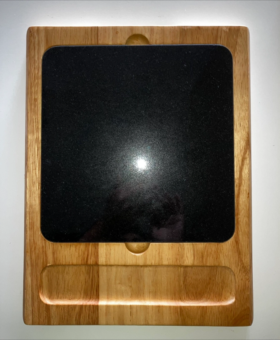 Brand new cutting board made of hardwood and black quartz.