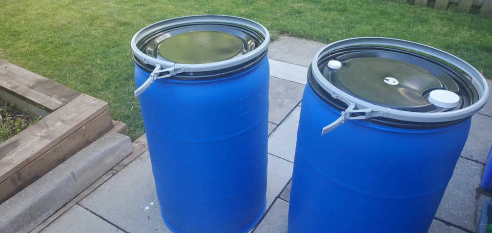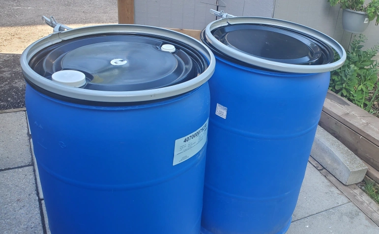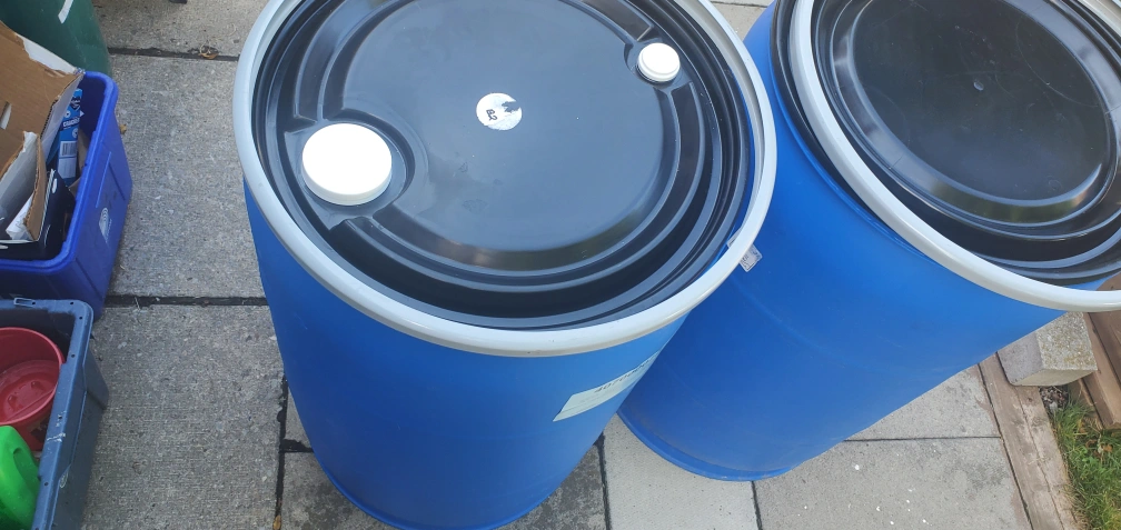 Blue plastic 55-gallon drums are available comes with metal band and closed or bung plastic lid. food grade or rain water collection, ready for use.
