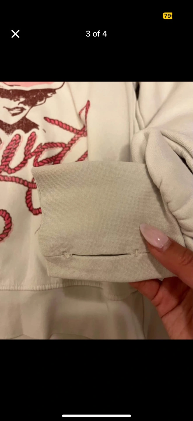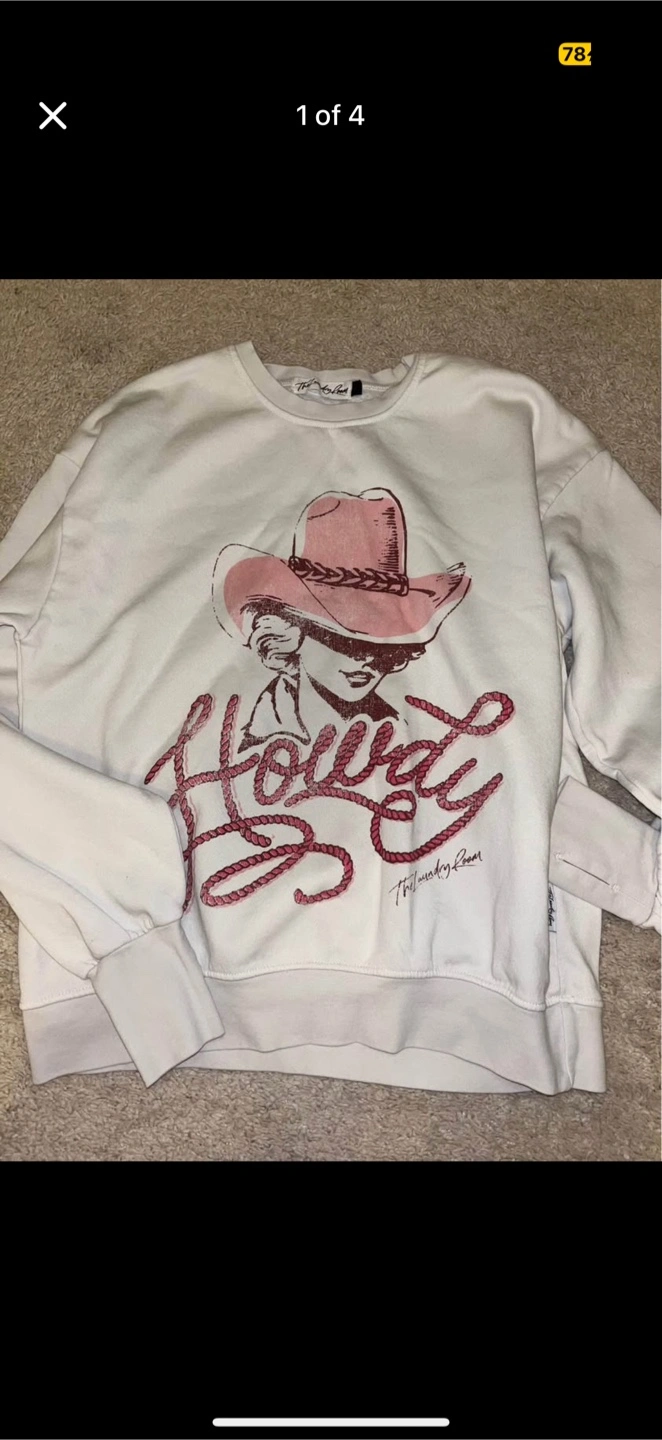 Selling a The Laundry Room crewneck sweatshirt with a 'Howdy' design. It has a light-coloured base with a pink graphic featuring a cowgirl. Very cozy and perfect for stampede. Has thumbholes. Only worn once!
