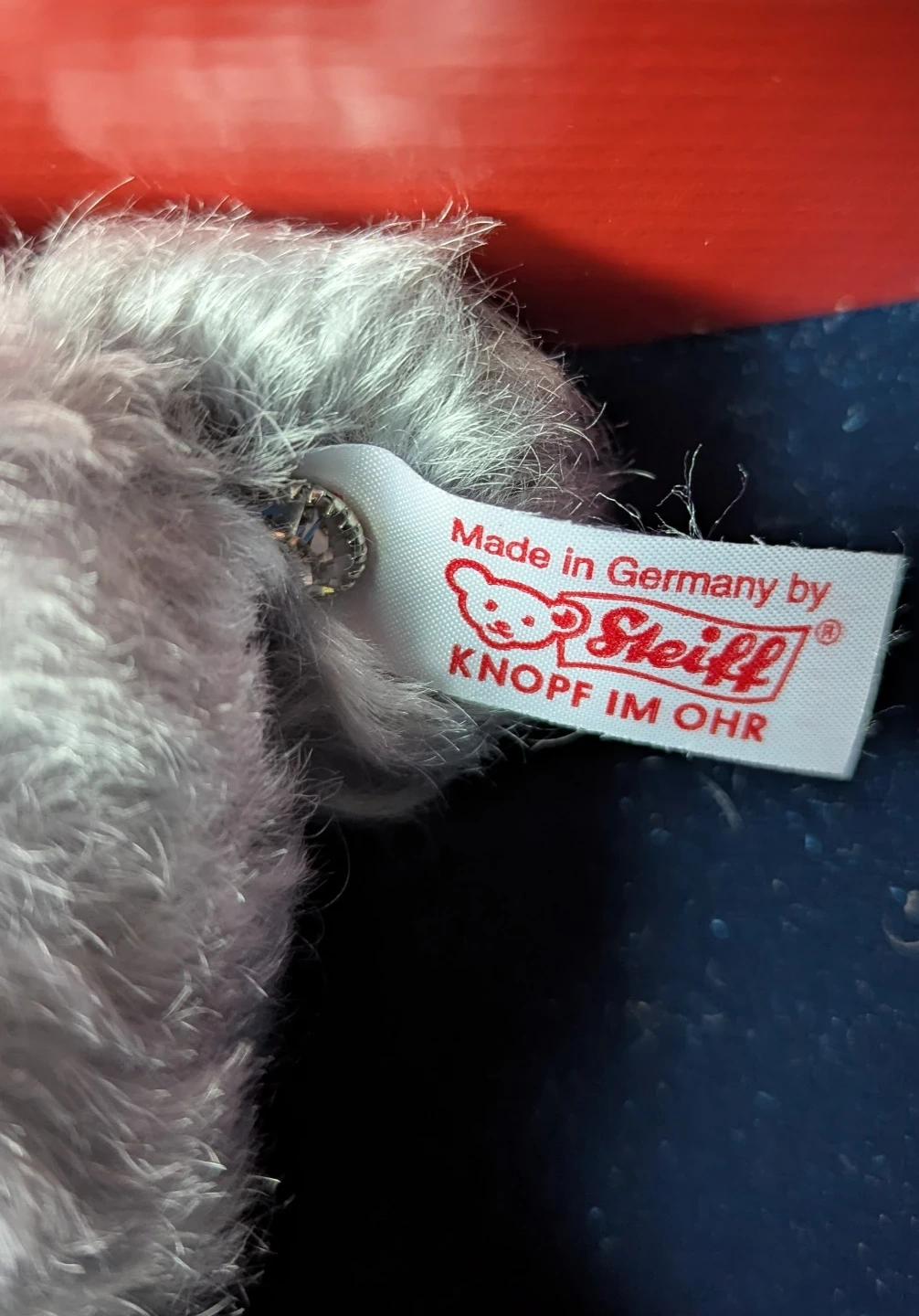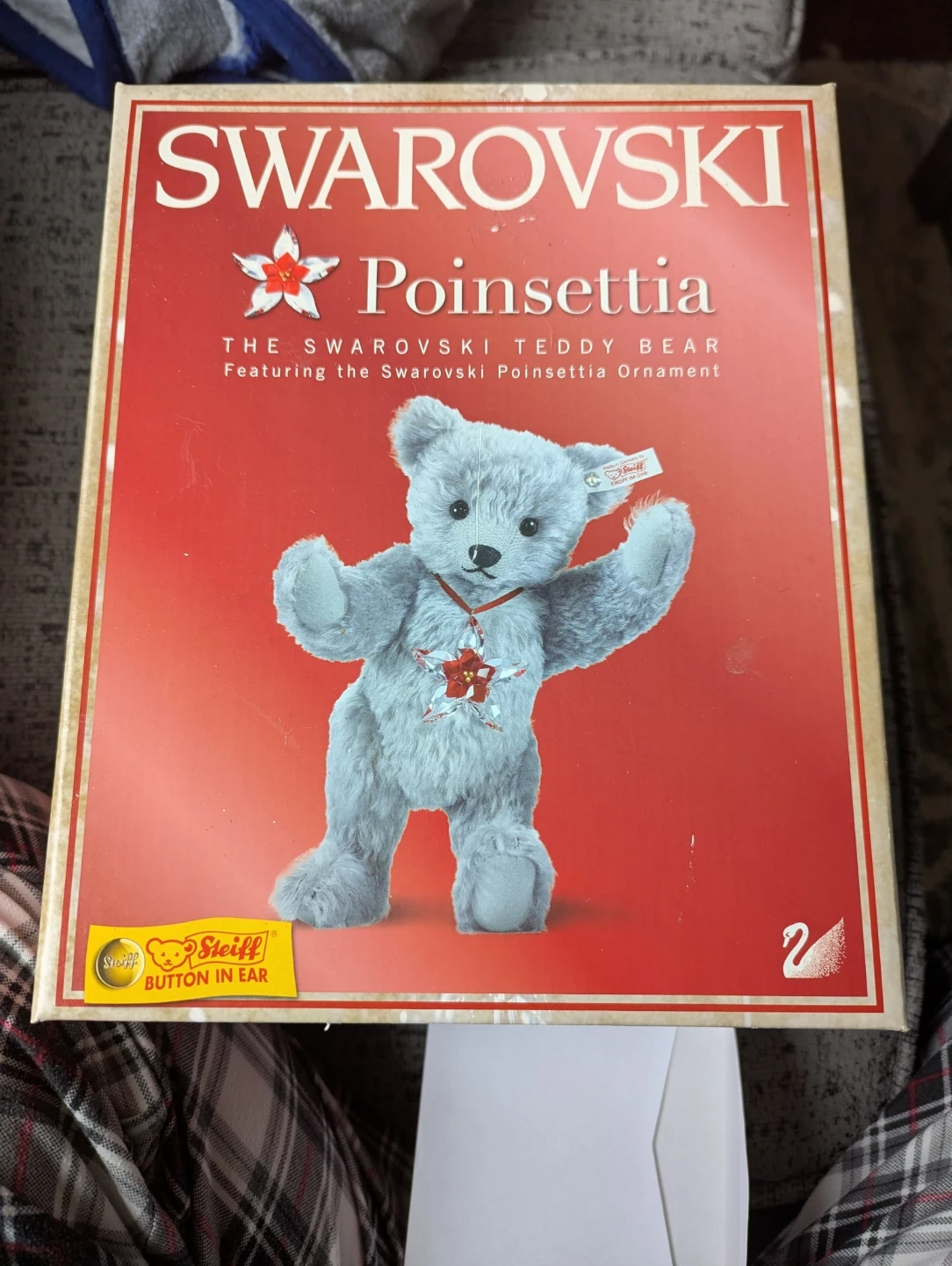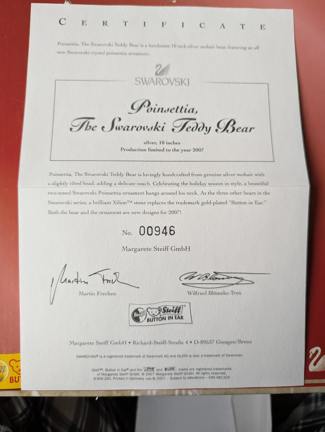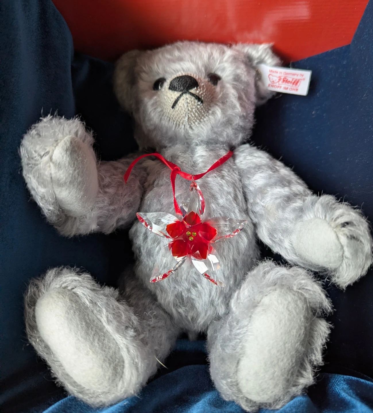 This is a 10-inch silver mohair teddy bear, handmade by Steiff. It features a new Swarovski crystal poinsettia ornament. Production was limited to the year 2007.