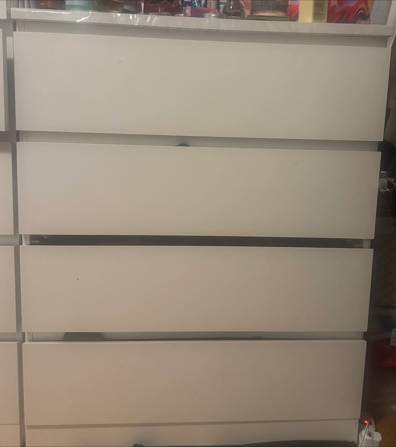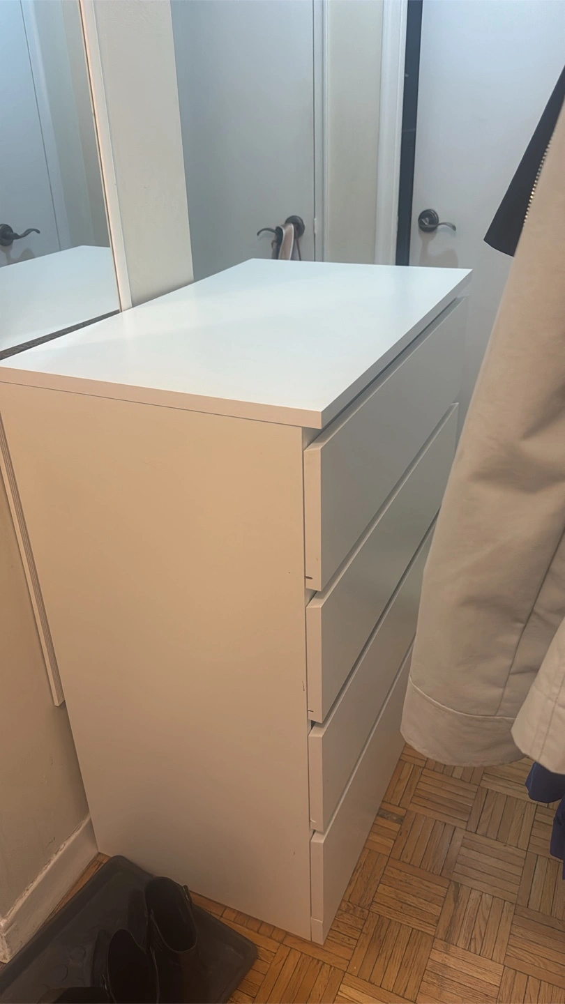 White dresser with four drawers. It's a great storage solution for any room. The drawers slide smoothly. Its clean design fits with many decor styles.