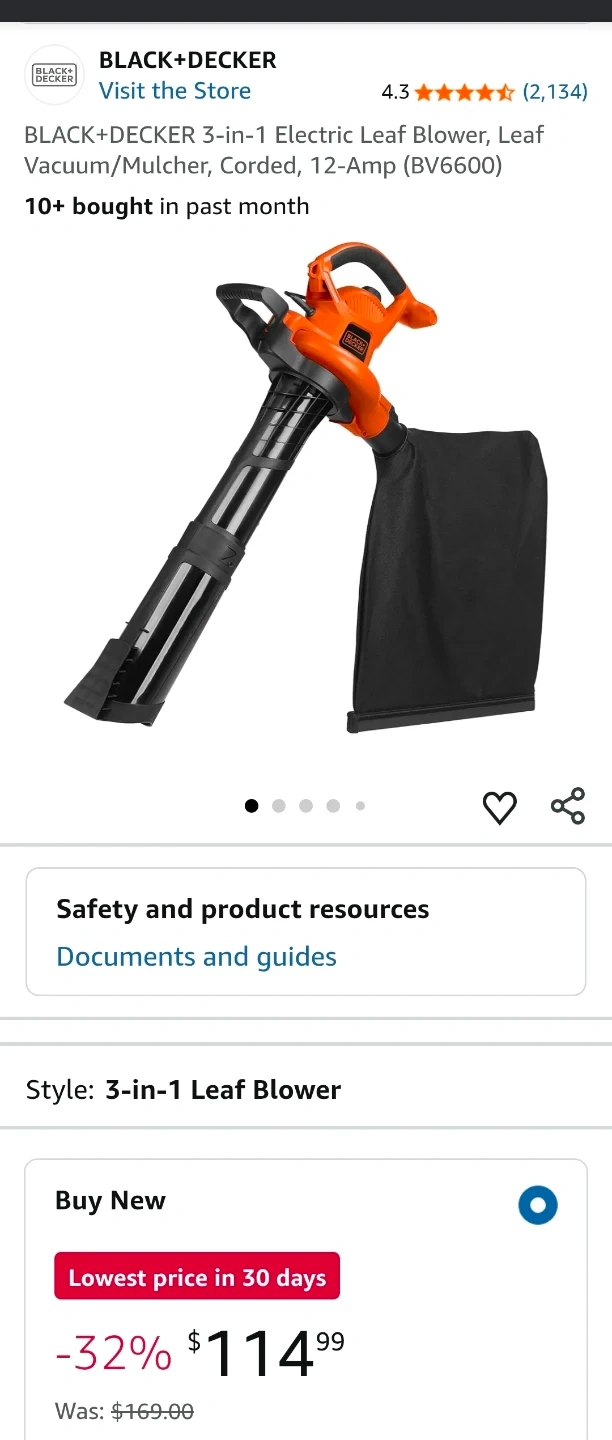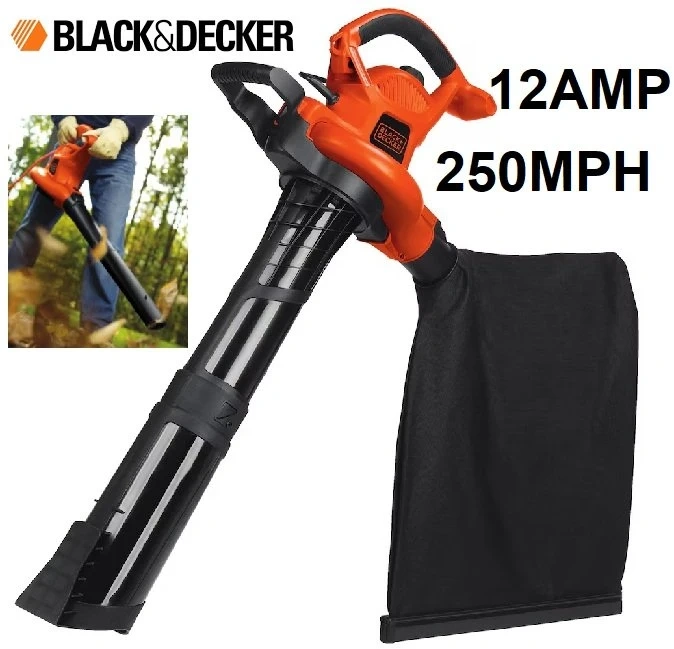 I'm selling a Black+Decker 3-in-1 electric leaf blower, leaf vacuum, and mulcher, perfect for keeping your yard tidy. This corded, 12-amp tool is in good condition, ready to tackle leaves, grass clippings, twigs, and other debris from all lawn surfaces. It has variable speed selections and easily converts from a blower to a vacuum to a mulcher. It also features a high-impact metal fan to prevent clogging when mulching, grinding up to 16 bags of leaves down to 1.