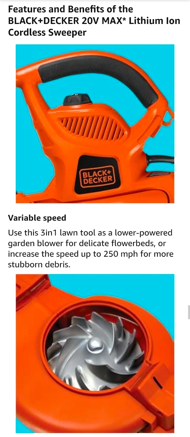* 12 amp motor operates a 3-in-1 blower, vacuum, and mulcher