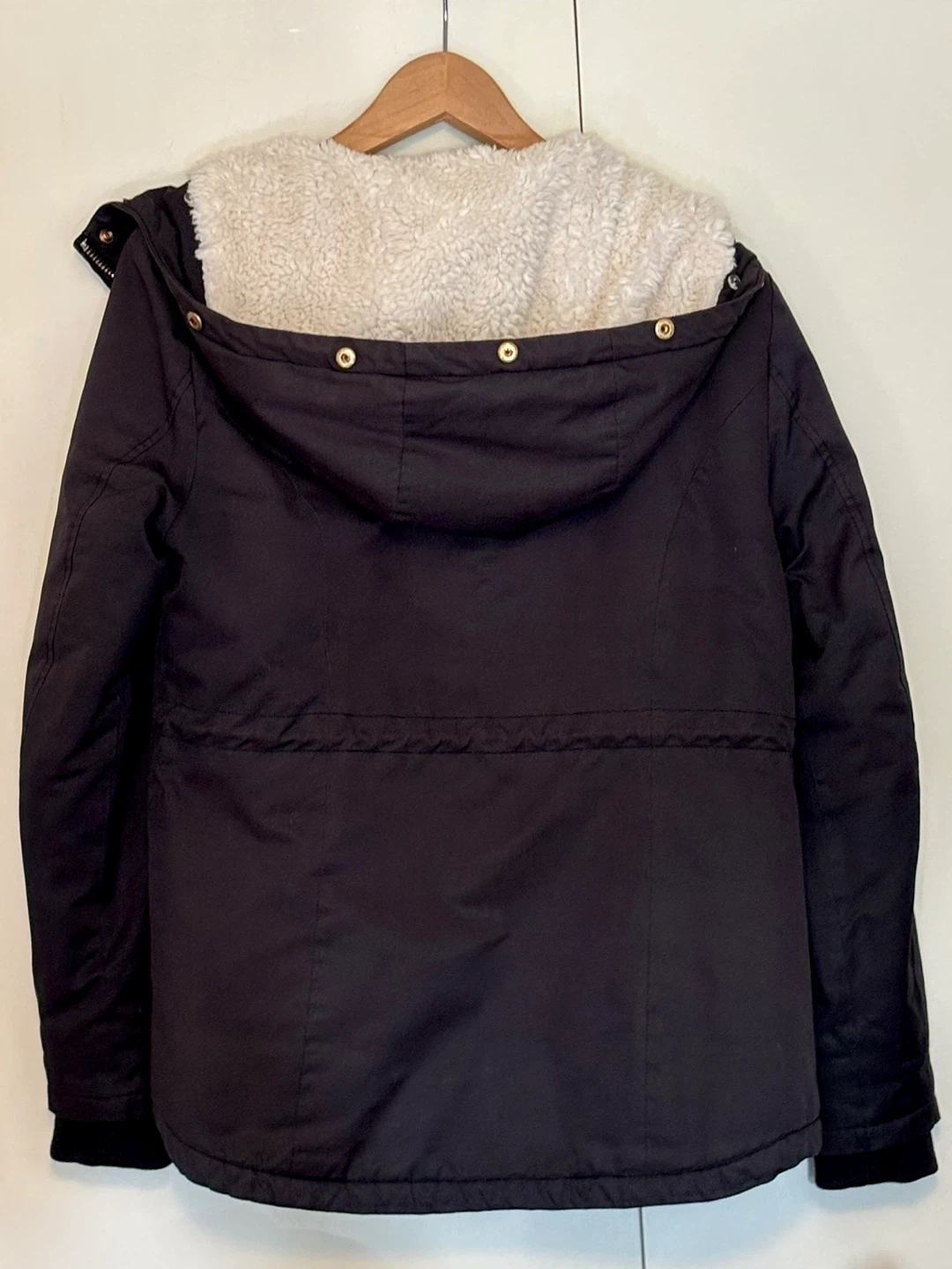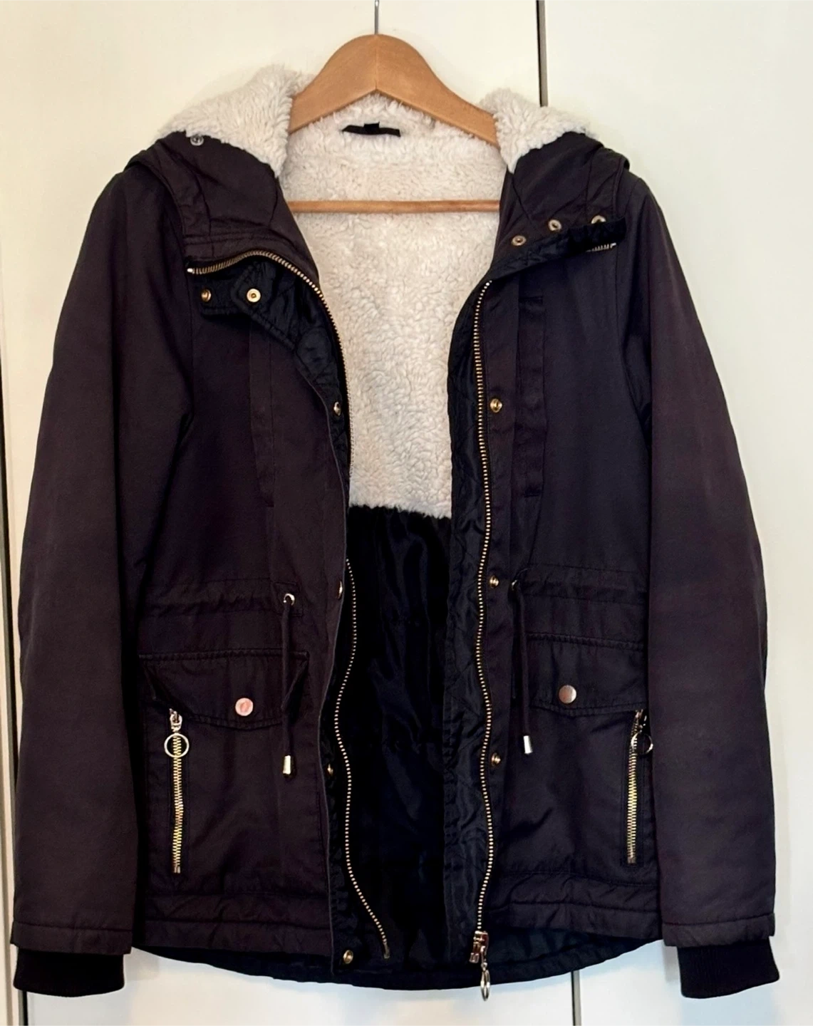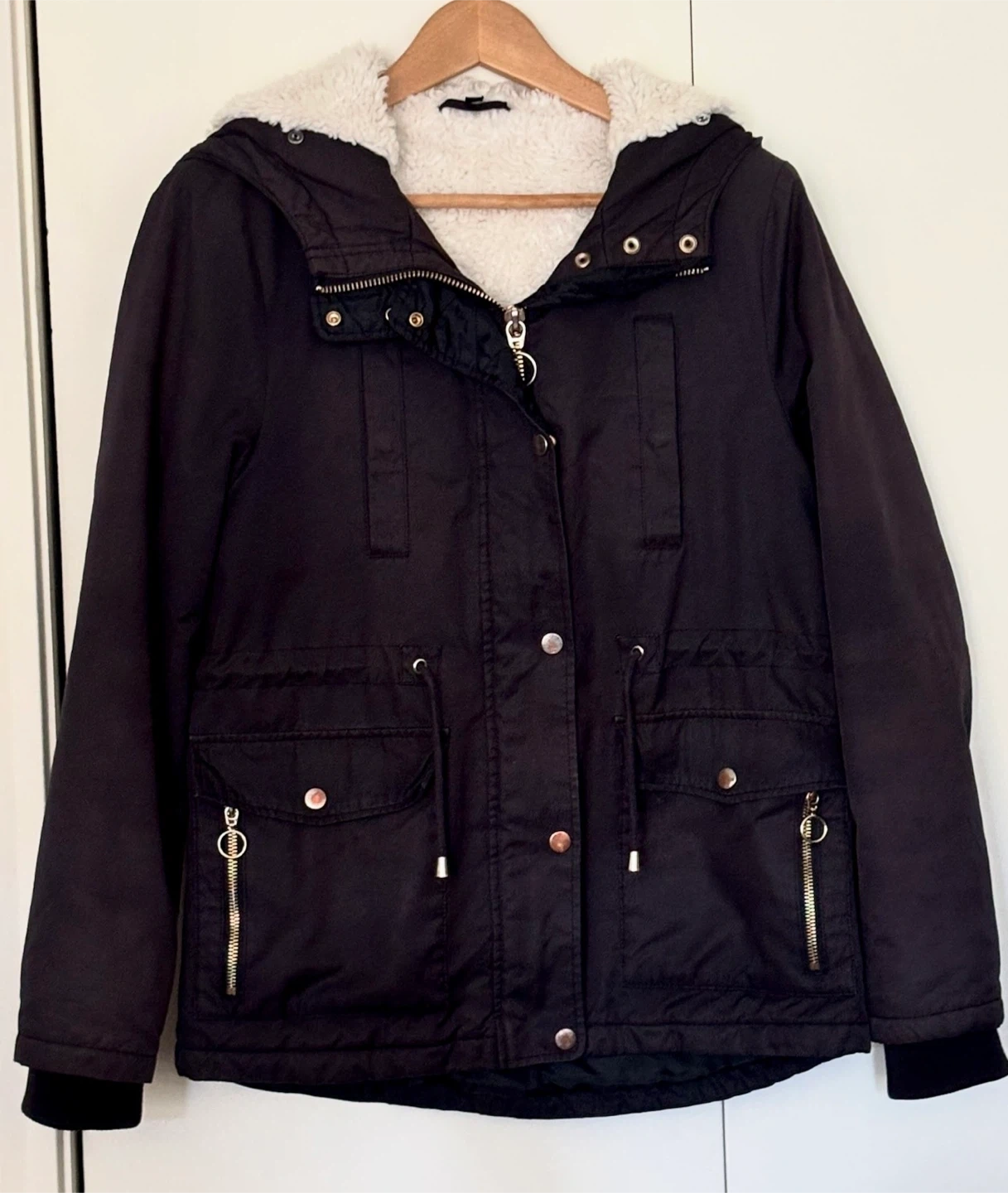 TOPSHOP black parka jacket. It's lined with cozy sherpa for extra warmth. Lots of pockets! This jacket is a UK size 10. It features a drawstring waist for a customized fit. No rips or stains.