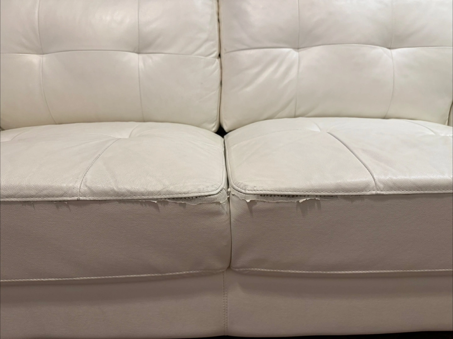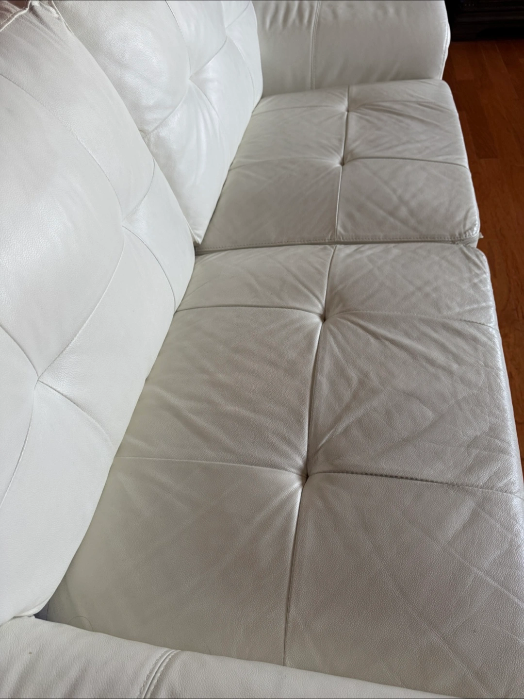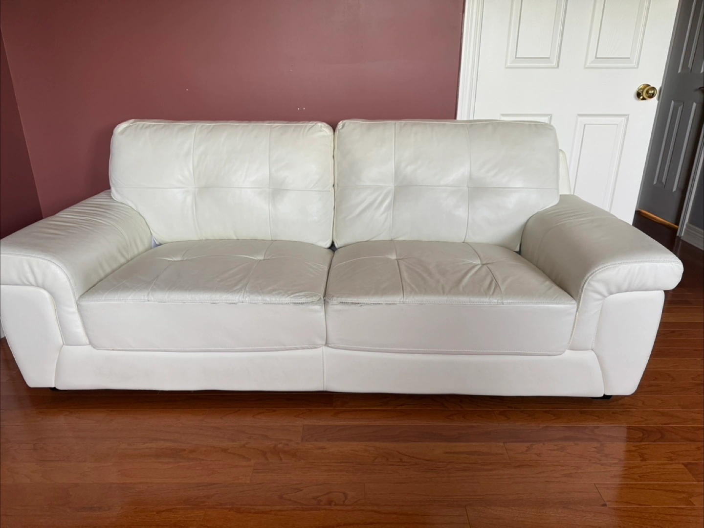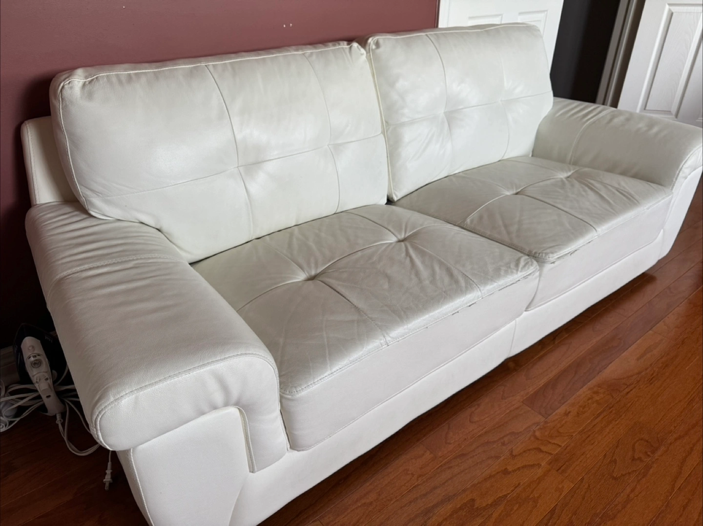 Selling a white leather sofa. It's in good condition with a little wear and tear in the middle part (as pictured). The sofa has a classic design with a comfortable seating area, would look great in any living room. It's perfect for relaxing or entertaining guests!
