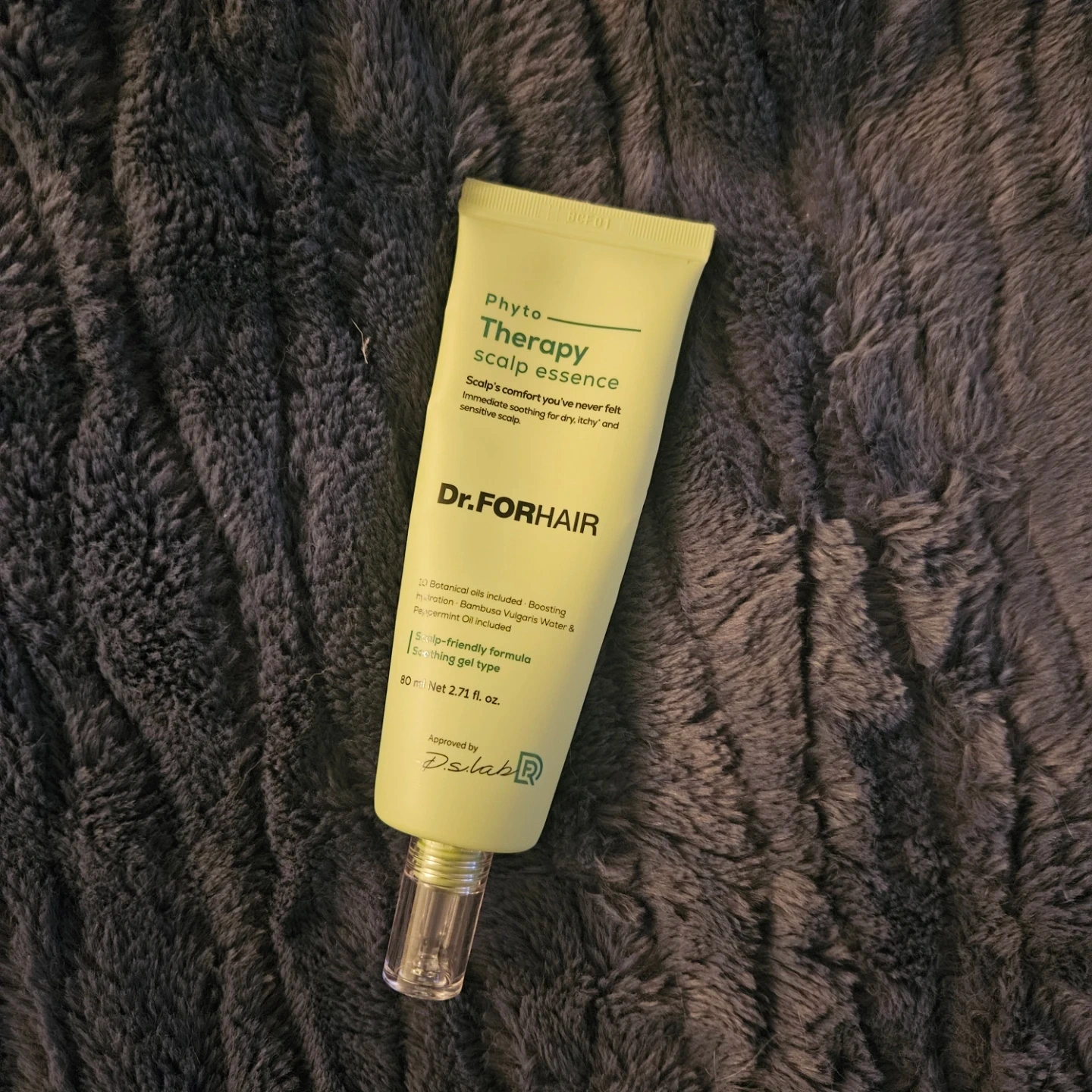 Dr.FORHAIR Phyto Therapy scalp essence for immediate soothing comfort. It's a scalp-friendly formula with 10 botanical oils, Boosting hydration, Bambusa Vulgaris Water & Peppermint Oil. It's a soothing gel type, about 50% remaining.