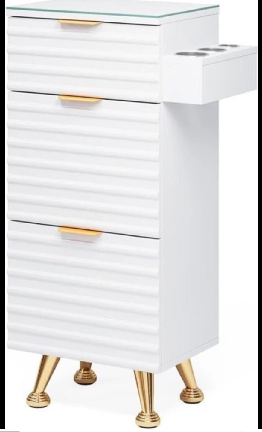 This cart has three drawers with gold handles and sits on gold legs. It also includes a top glass surface and side compartments for tools. Perfect for a salon or spa setting!