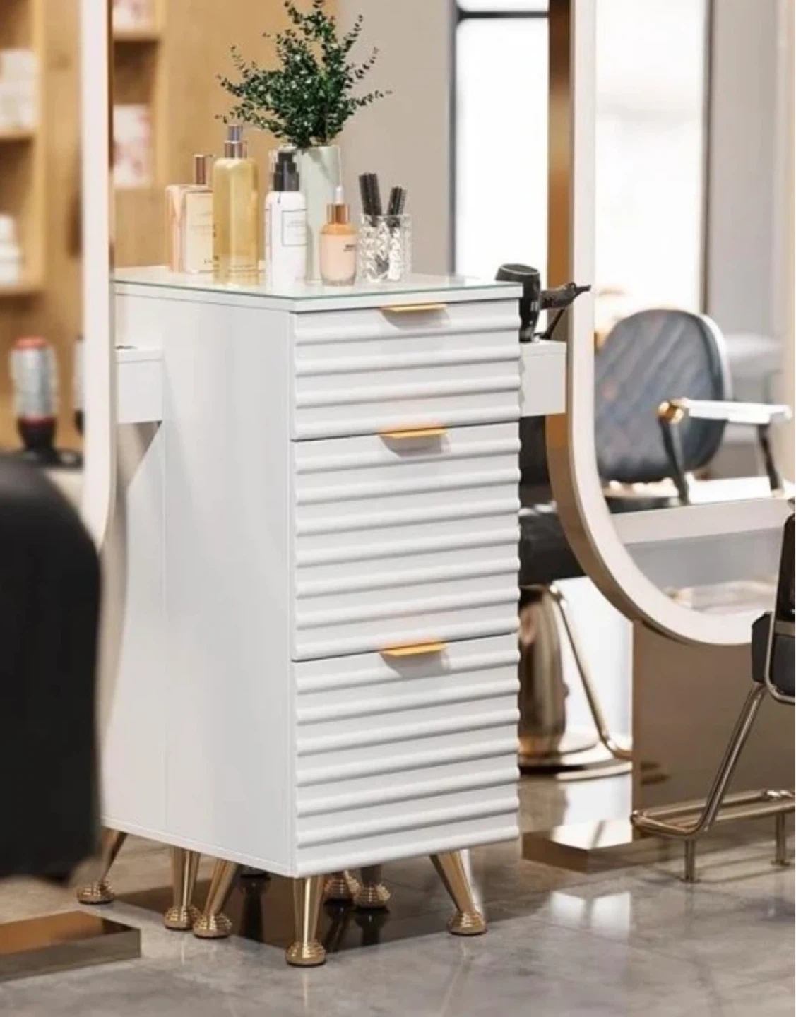 White rolling salon cart with gold accents