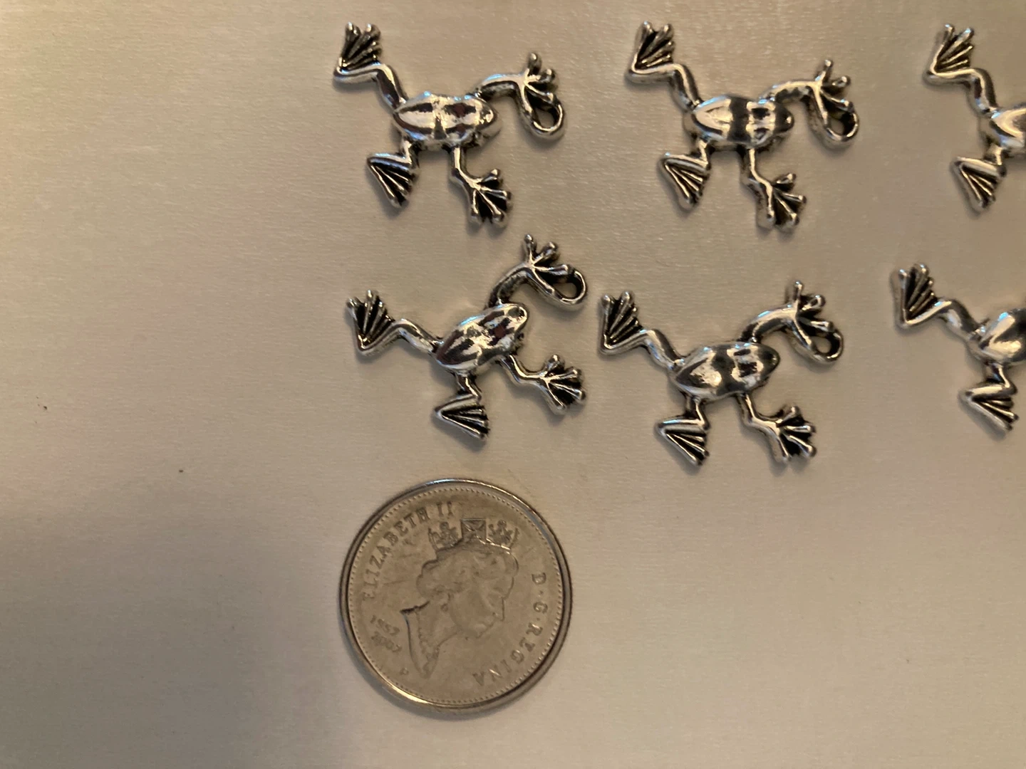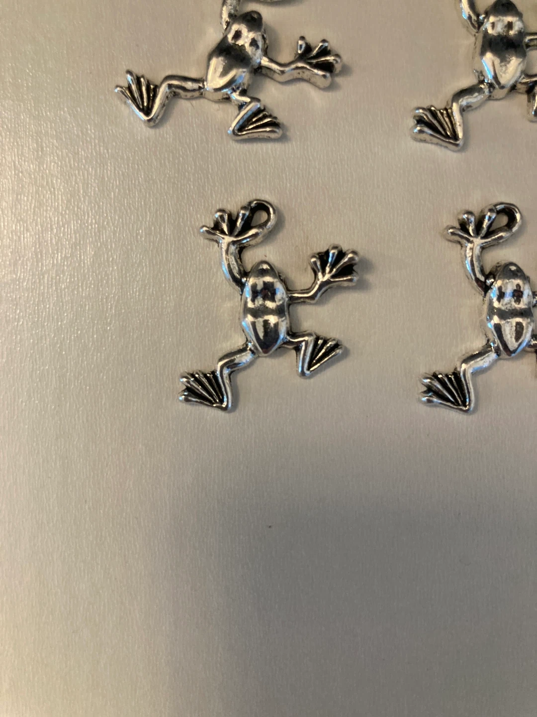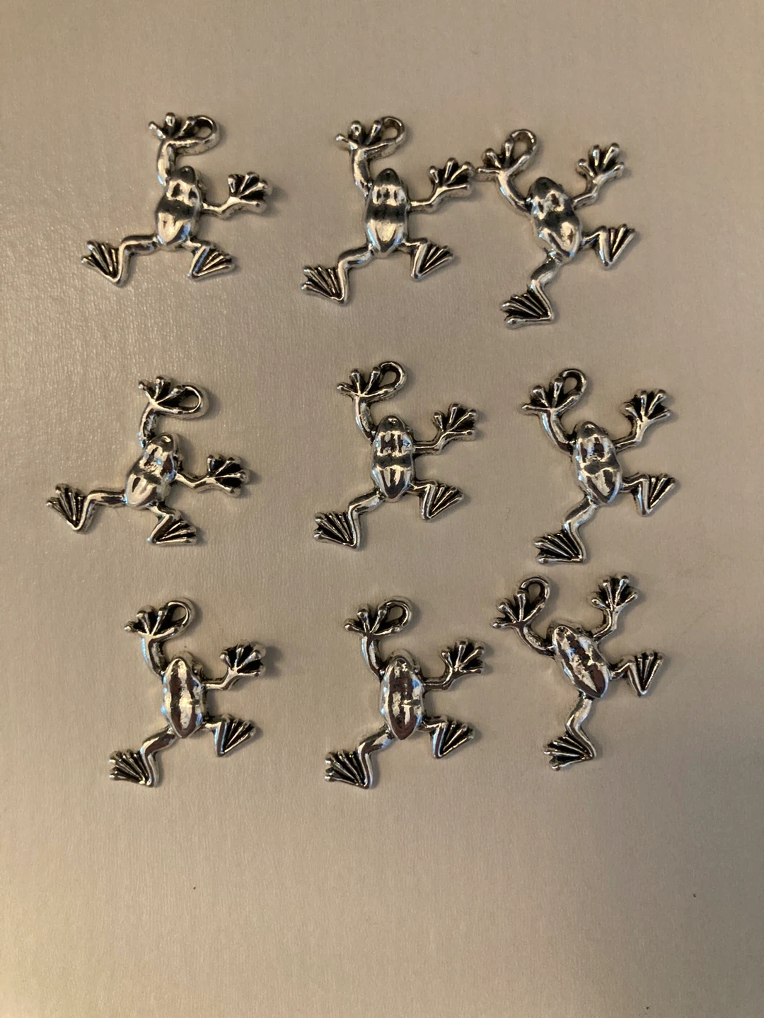 Nine silver-tone frog charms are included. These charms are made of metal. They're perfect for crafts or jewellery making!