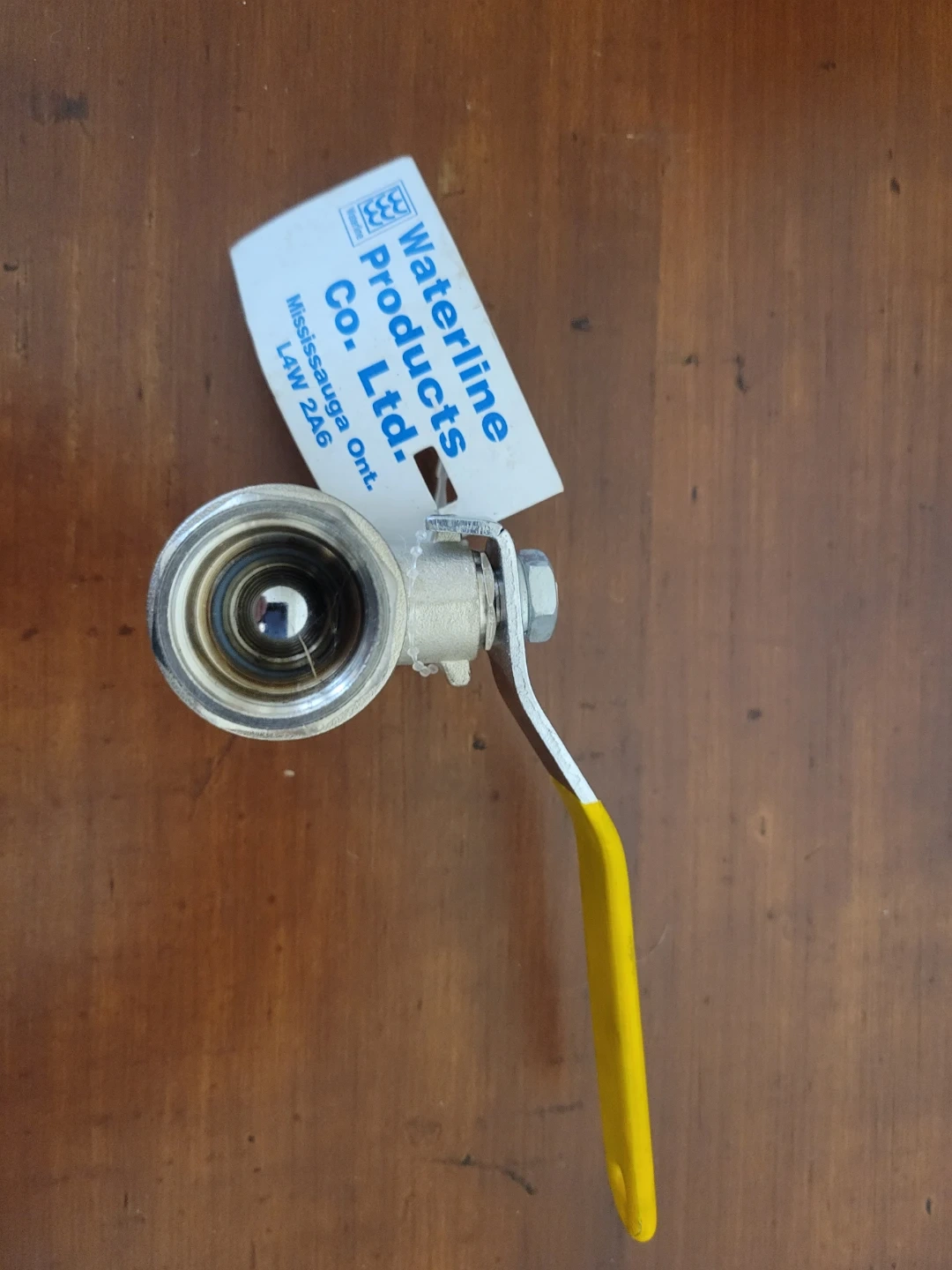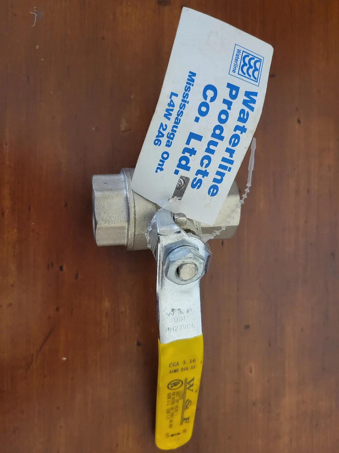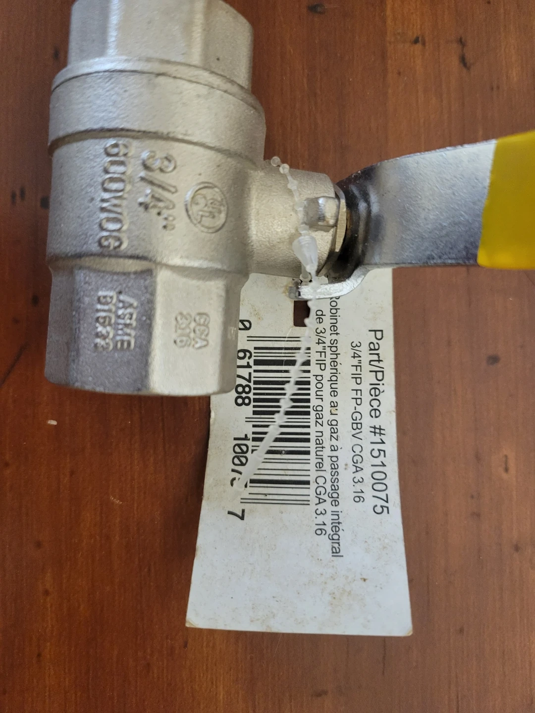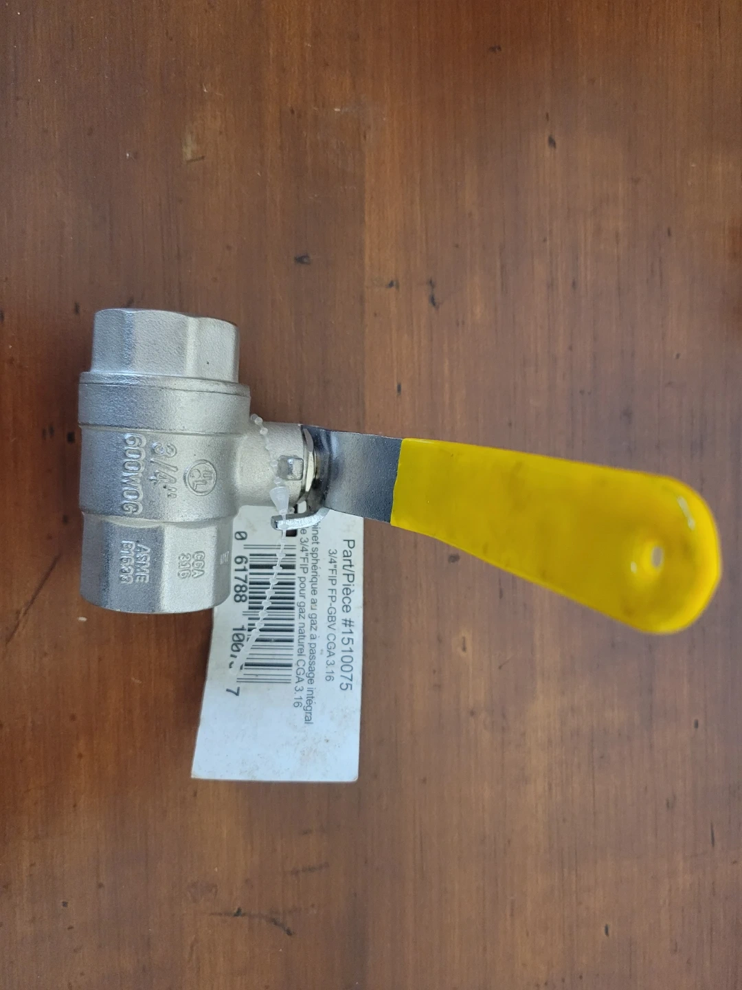 This is a 3/4" ball valve, ideal for natural gas applications. It's CGA 3.16 and ASME B16.33 certified. Valve material is brass with a yellow handle.
