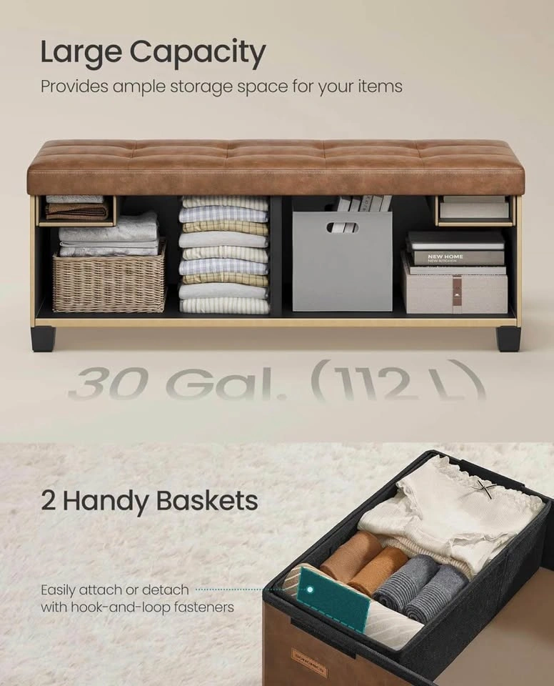 I am selling a brand new SONGMICS storage ottoman bench. It features legs and is made with synthetic leather. It offers ample storage space and comes with two handy baskets that easily attach or detach. The maximum static weight capacity is 660 lb (300 kg). I have 2 available.