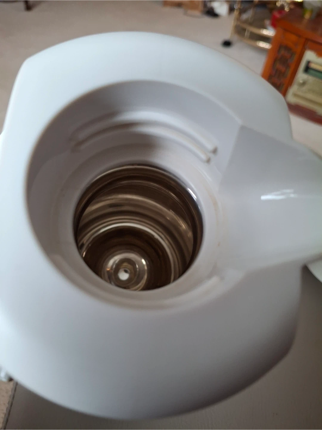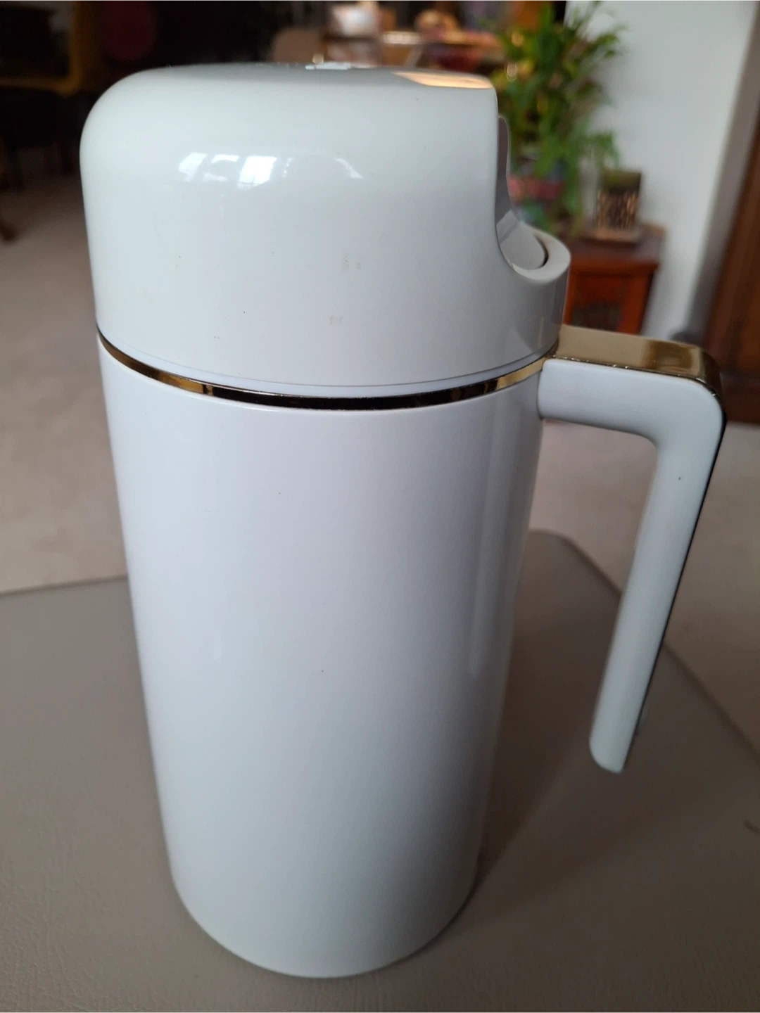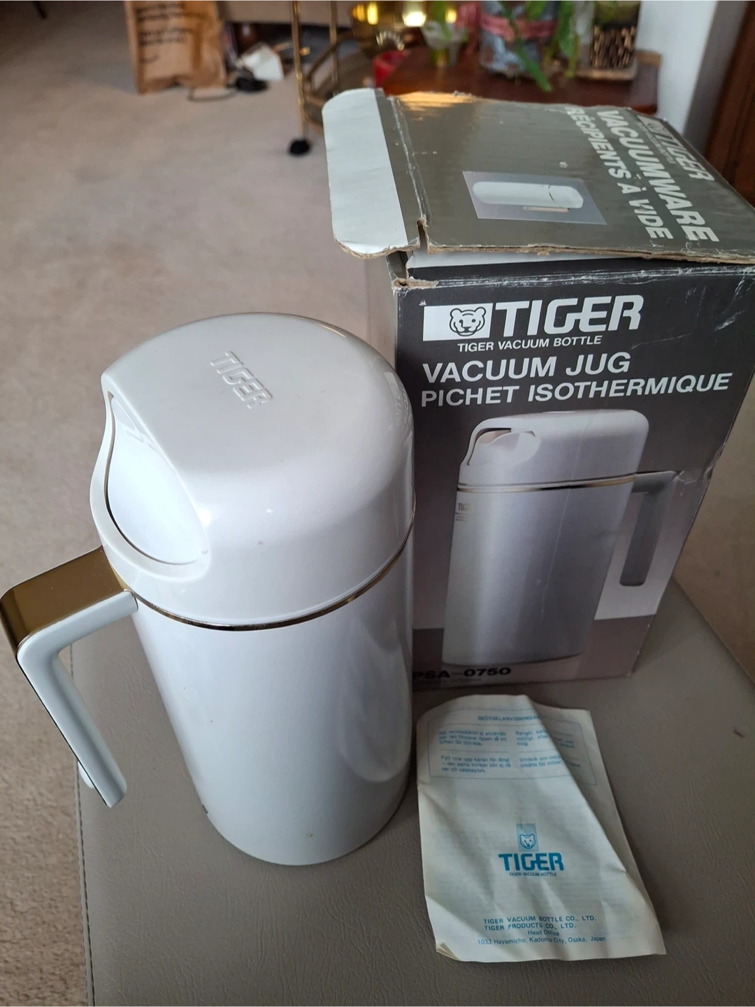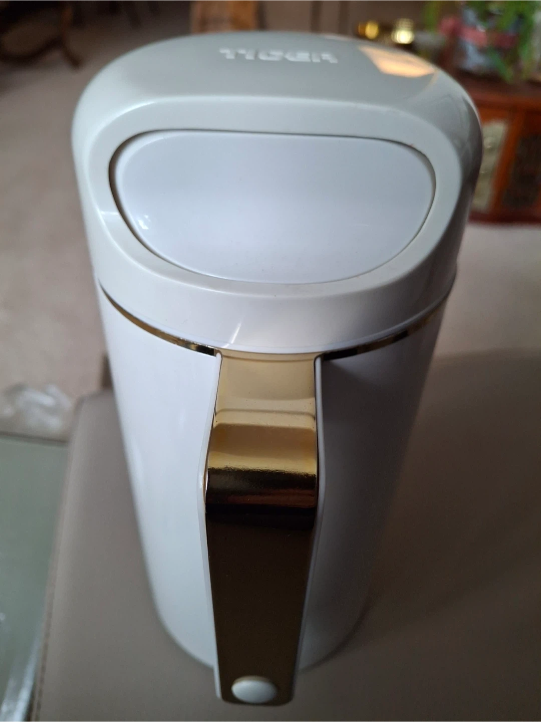 Tiger vacuum jug in white with gold accents. It's made of durable plastic and has a stainless steel interior. The lid features a press-button release for easy pouring. It's great for keeping beverages hot or cold.