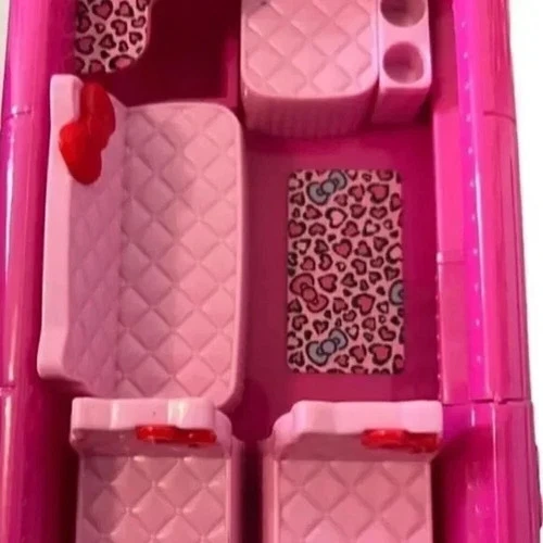Adorable vintage Hello Kitty pink collectible car featuring classic Sanrio graphics and charming interior details. This iconic piece showcases Hello Kitty styling throughout, including printed seats, cute accents, and a fold-open back that reveals a fun dance floor / DJ scene—perfect for display or imaginative play. A must-have for Hello Kitty collectors, Sanrio fans, or anyone who loves nostalgic Y2K toys. Harder to find and full of character, this piece makes a great shelf display or addition to a curated collection.