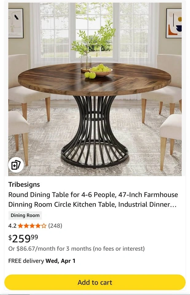 Brand new in box Tribesigns Round Dining Table for 4-6 People, 47-Inch Farmhouse Dinning Room Circle Kitchen Table, Industrial Dinner Table with Metal Base for Kitchen, Living Room, Black and Brown. Pickup near Argyle.