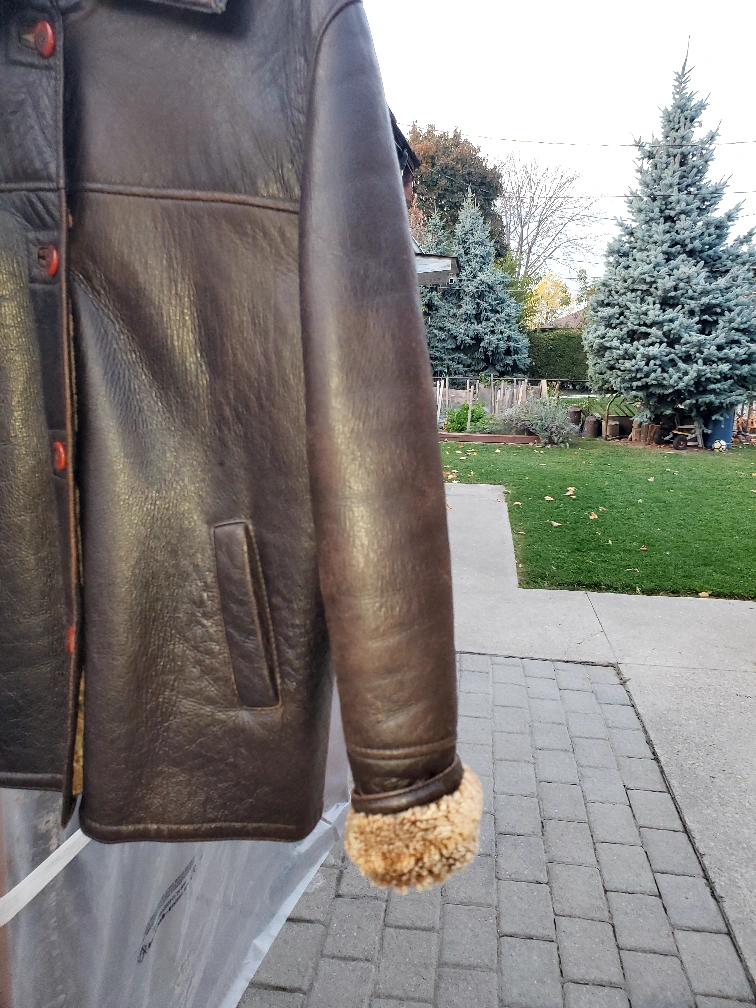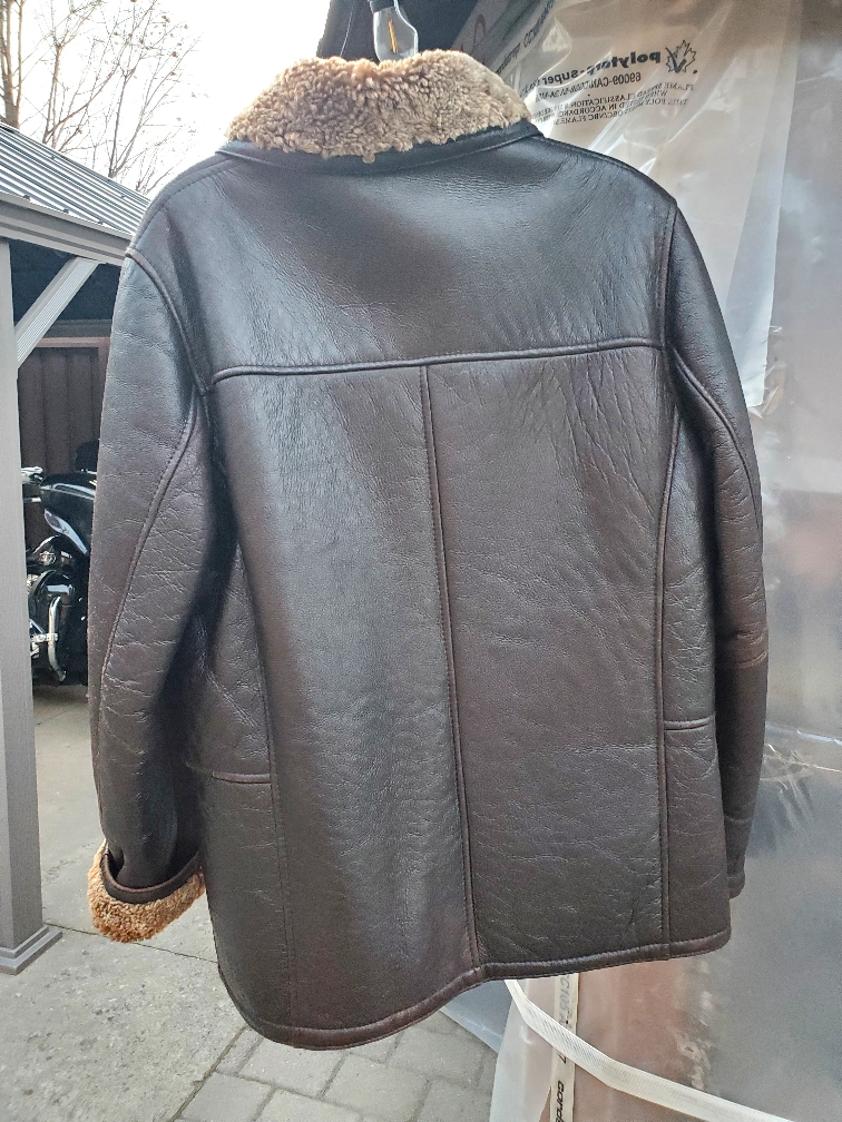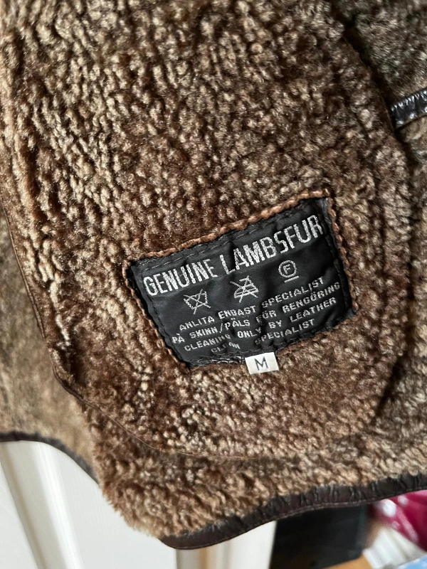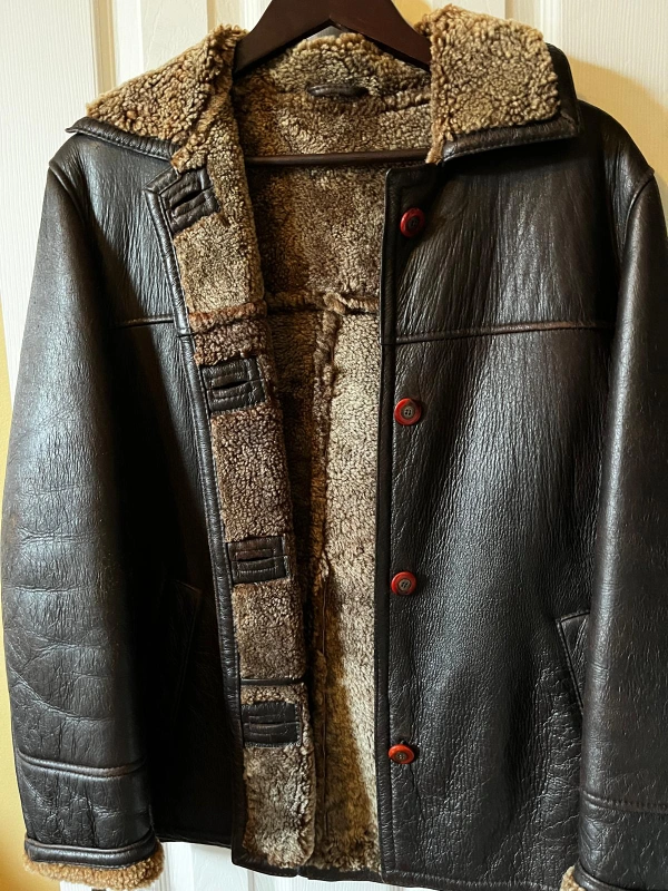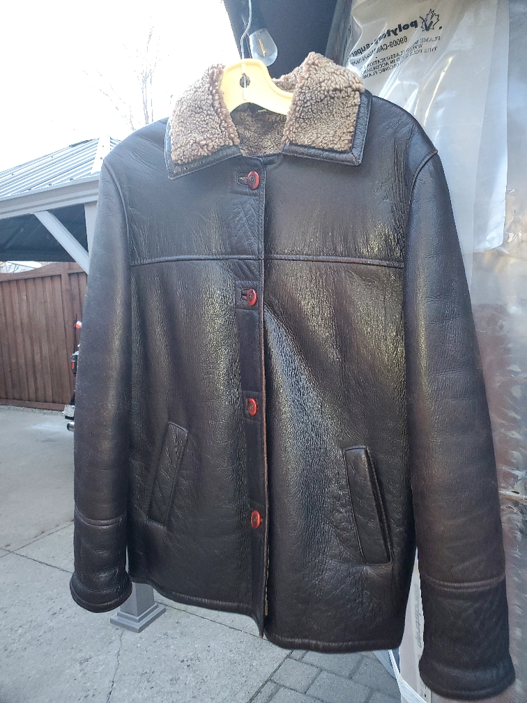 Brown leather jacket with shearling collar and lamb sherpa. Snap button closure and two pockets. Size Medium free of pet and smoke