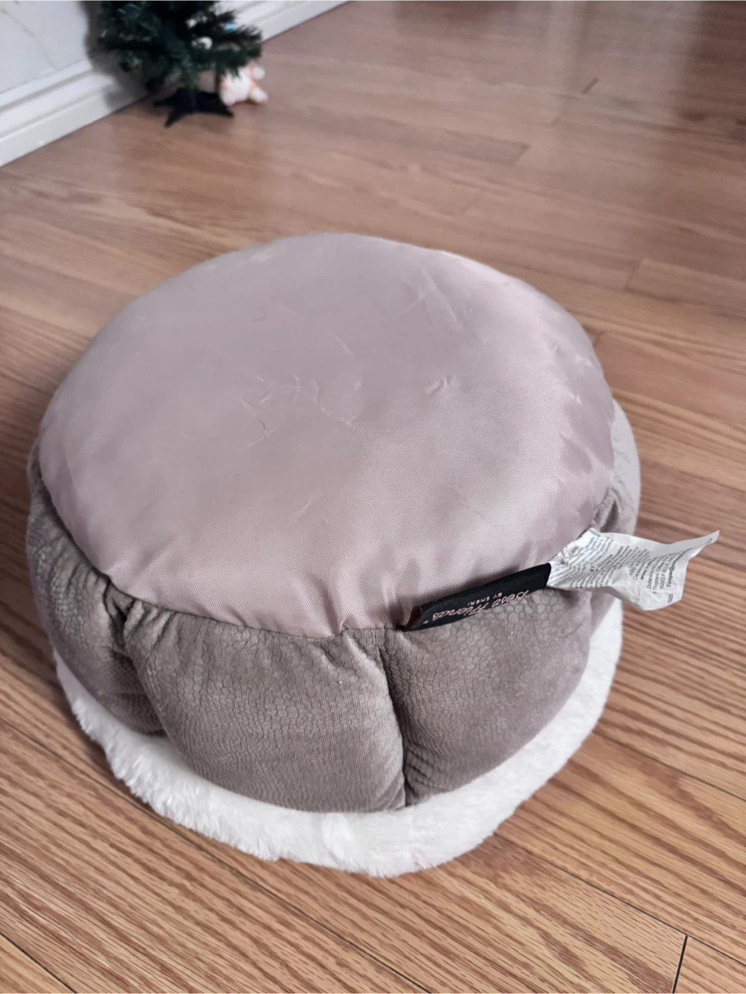 A comfy, fluffy, round pet bed! It's in great condition, not used and perfect for a small dog or cat. The bed is white and grey, and super soft and plushy