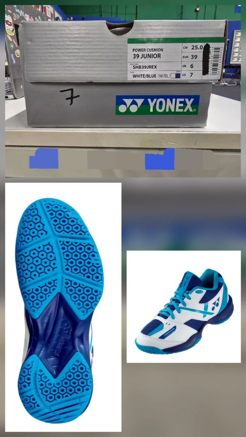 Brand new Yonex Power Cushion 39 Junior badminton shoes in white and blue. US size 7. Comes with original box.